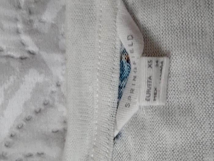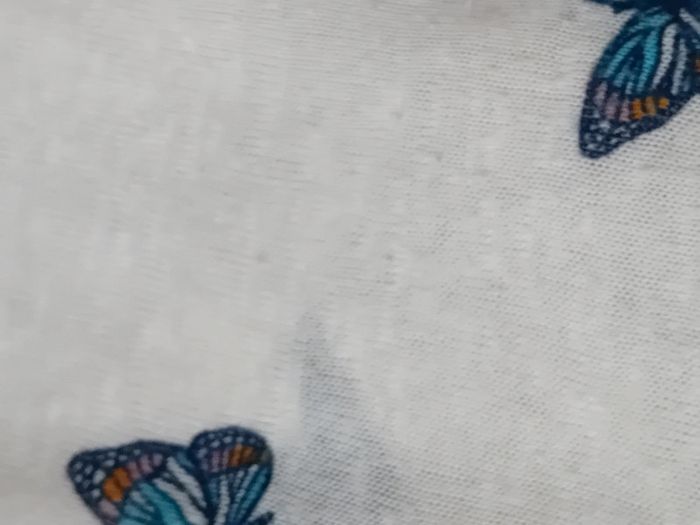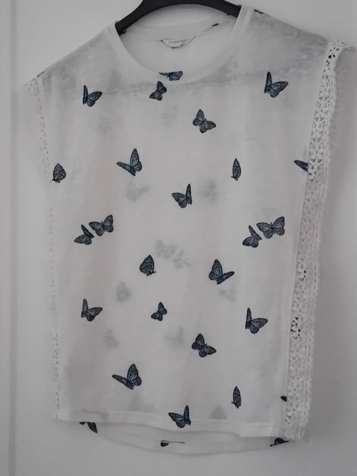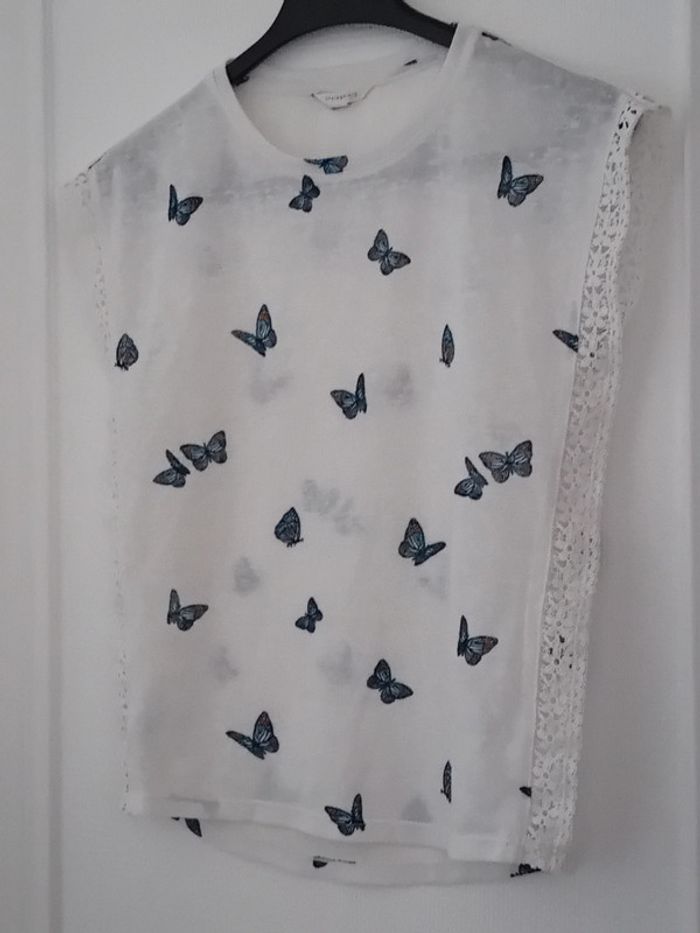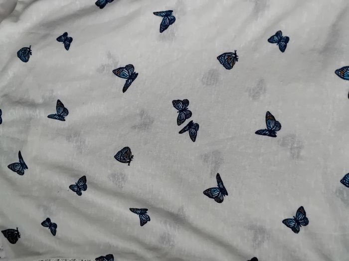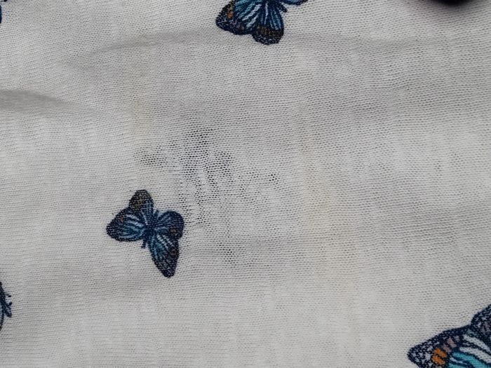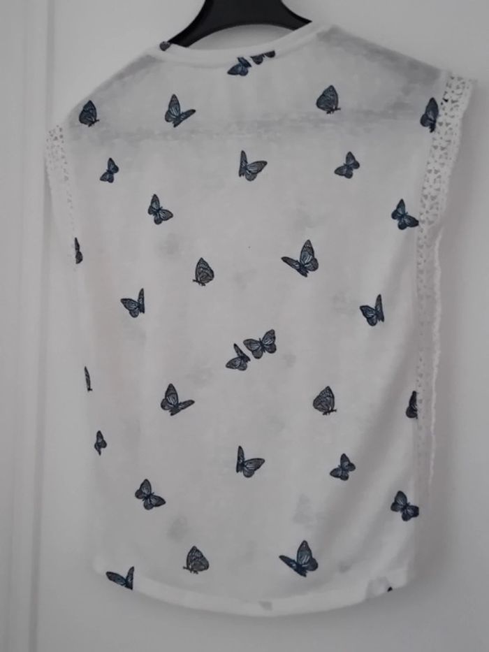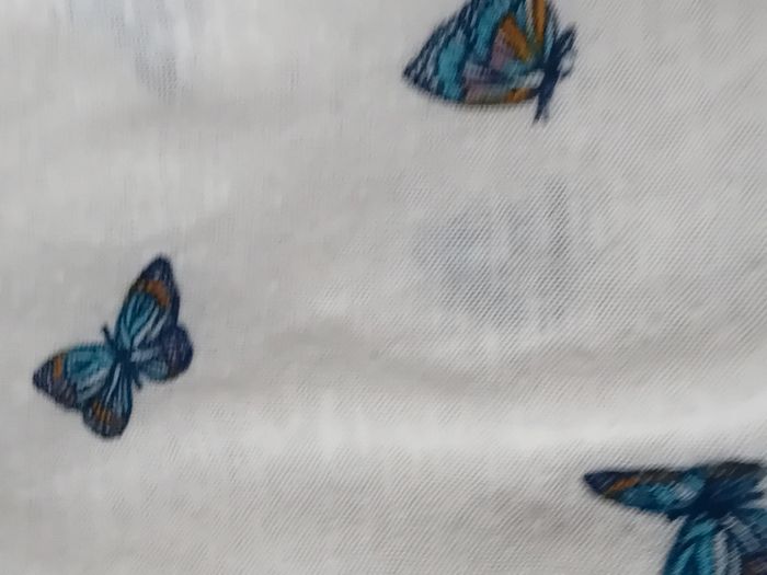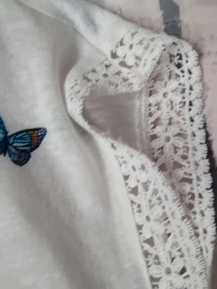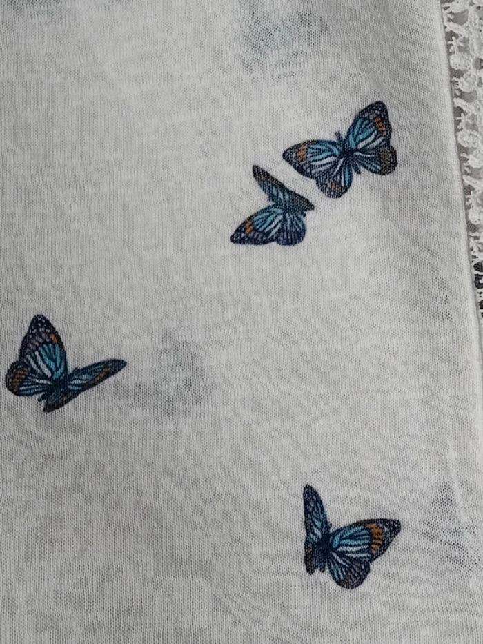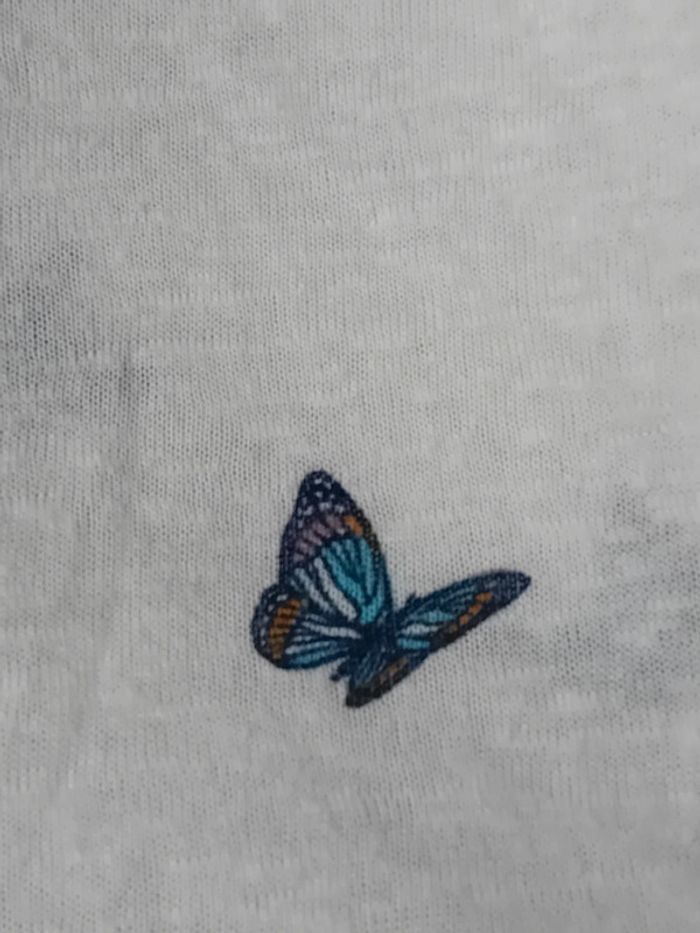 Pull débardeur en coton légèrement transparent blanc avec dentelles latérales motif papillons bleus col rond longueur 57 cm largeur aisselles à aisselles 48 cm largeur épaules 44 cm porté quelques fois enbon état ⚠️ mis à part une petite tâche jaunâtre sur le devant peu visible et quelques très légères peluches par endroit (voir dernières photos) n hésitez pas à faire un lot dans mon dressing pour bénéficier d une réduction #midole #midolefemme #midolefemmexs #pulldébardeur #pullleger #springfield #femme #femmexs #papillons