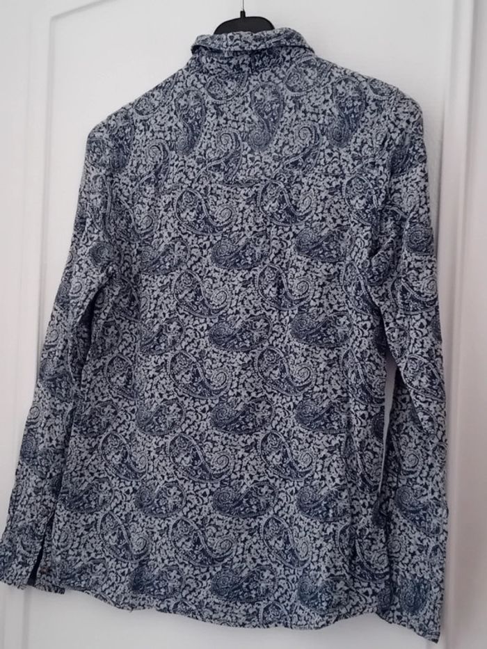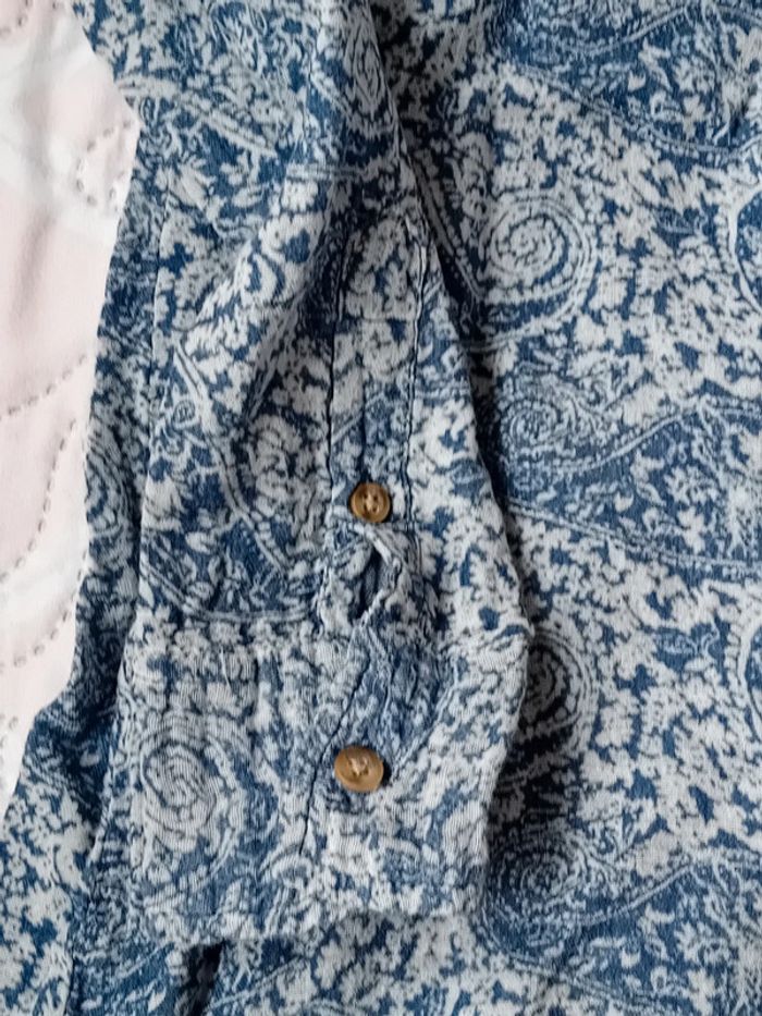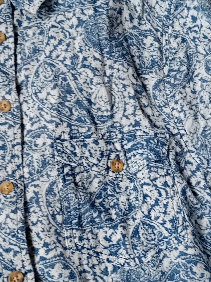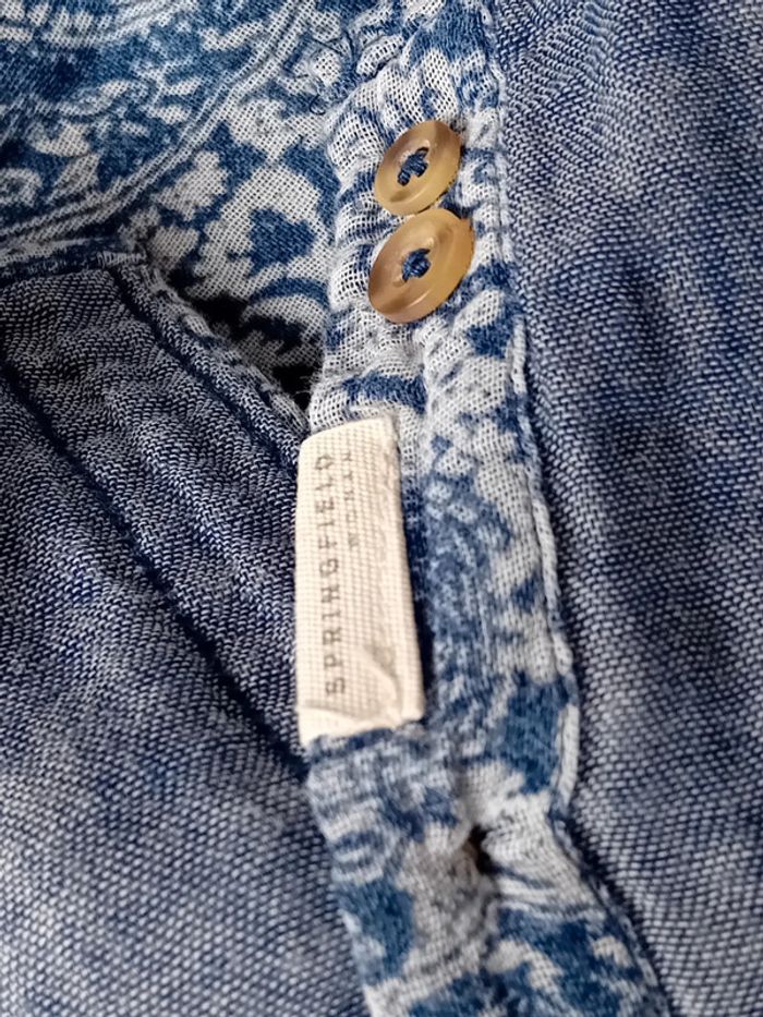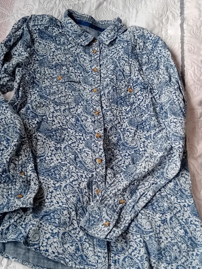 Chemise en coton léger manches longues poches sur le devant longueur 65 largeur aisselles à aisselles 47 cm largeur épaules 36 cm longueur manches 58 cm taille M correspond à un petit 38 taille petit très peu porté en très bon état n hésitez pas à faire un lot dans mon dressing pour bénéficier d une réduction #midole #midolefemme38 #midolefemme #chemisierfemme #springfield #motifarabesques #bleu #femme #femme38 #M
