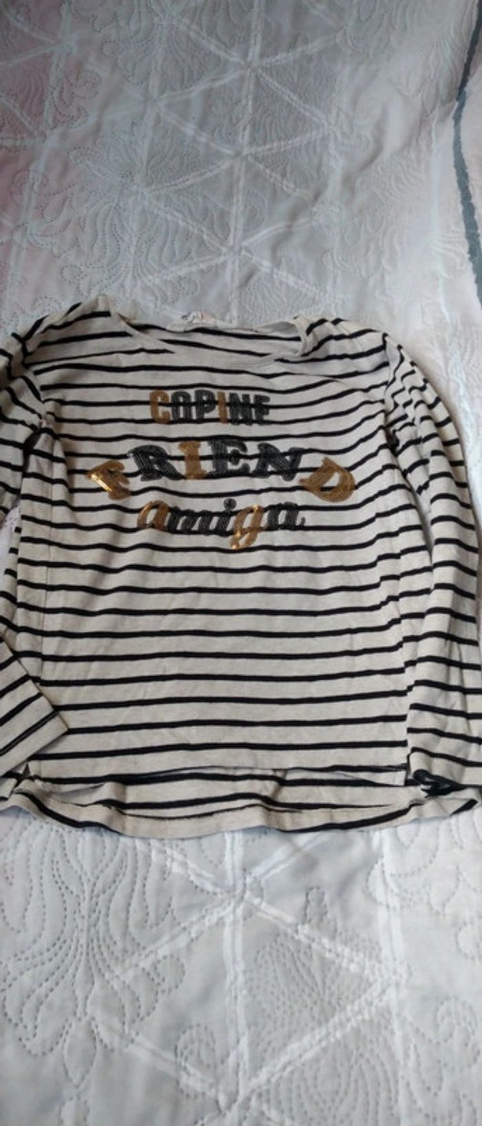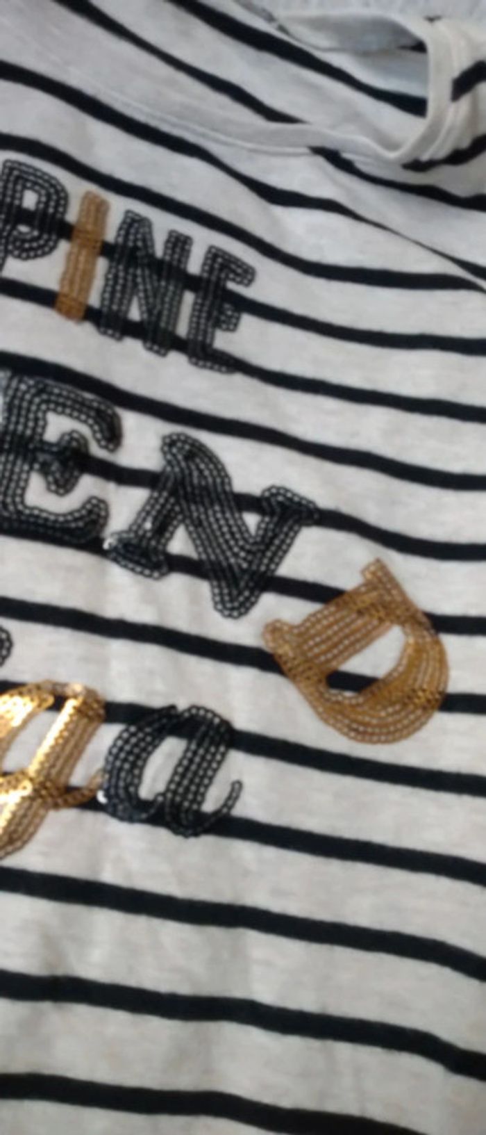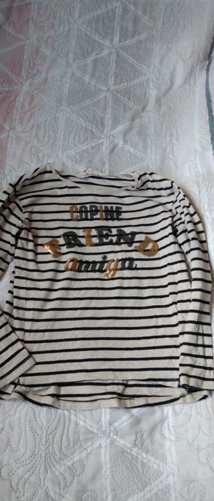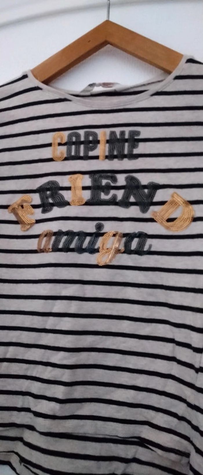 Tee-shirt manches longues en coton et elastanne avec rayures beiges grisé et noir texte en sequins sur le devant plus court devant que derrière longueur 44 cm devant 49 cm derrière largeur épaules 37 cm longueur manches 41 cm très peu porté en très bon état n hésitez pas à faire un lot dans mon dressing pour bénéficier d une réduction #midole #midoleenfant #fille #fille7ans #hm #sequin #rayures