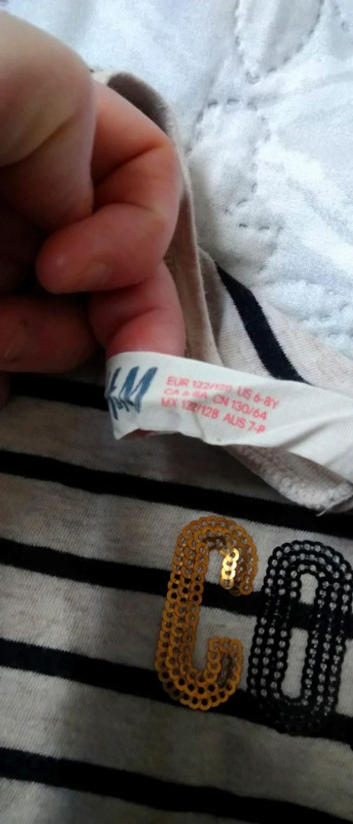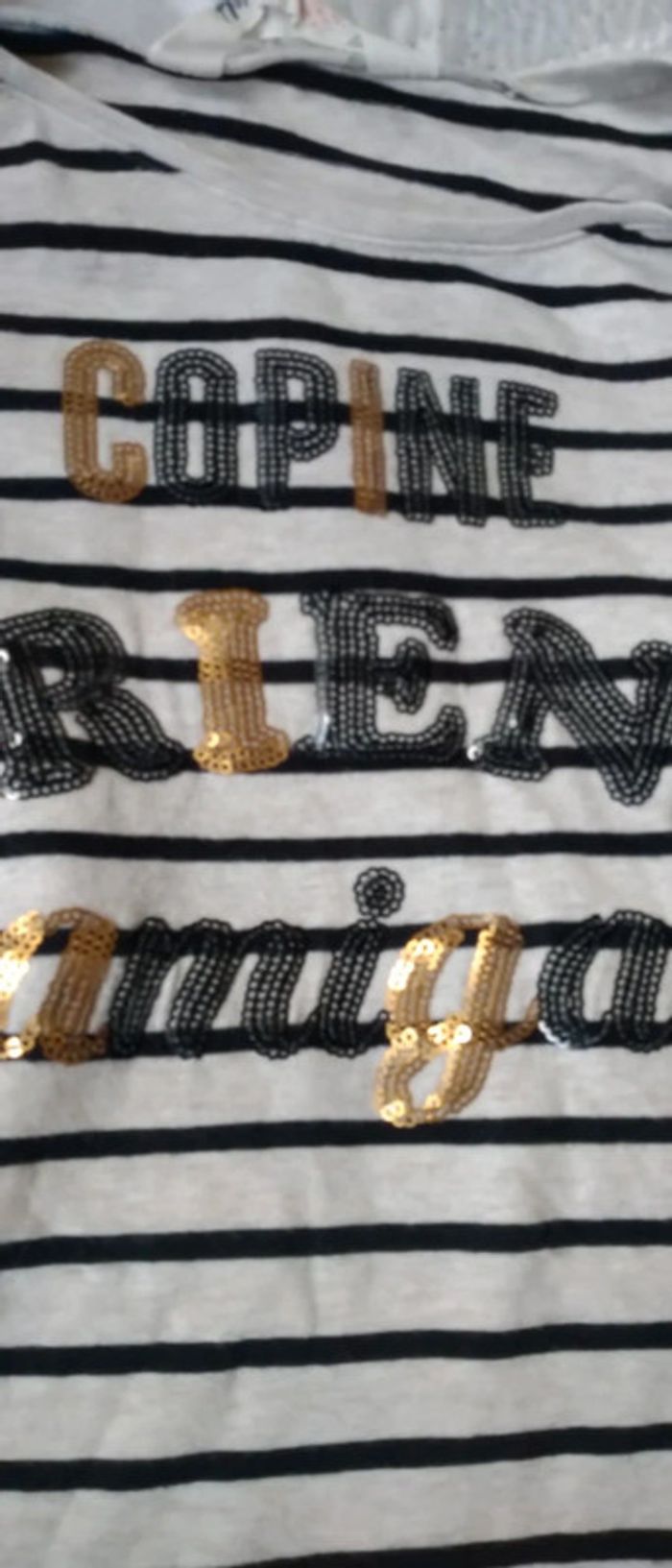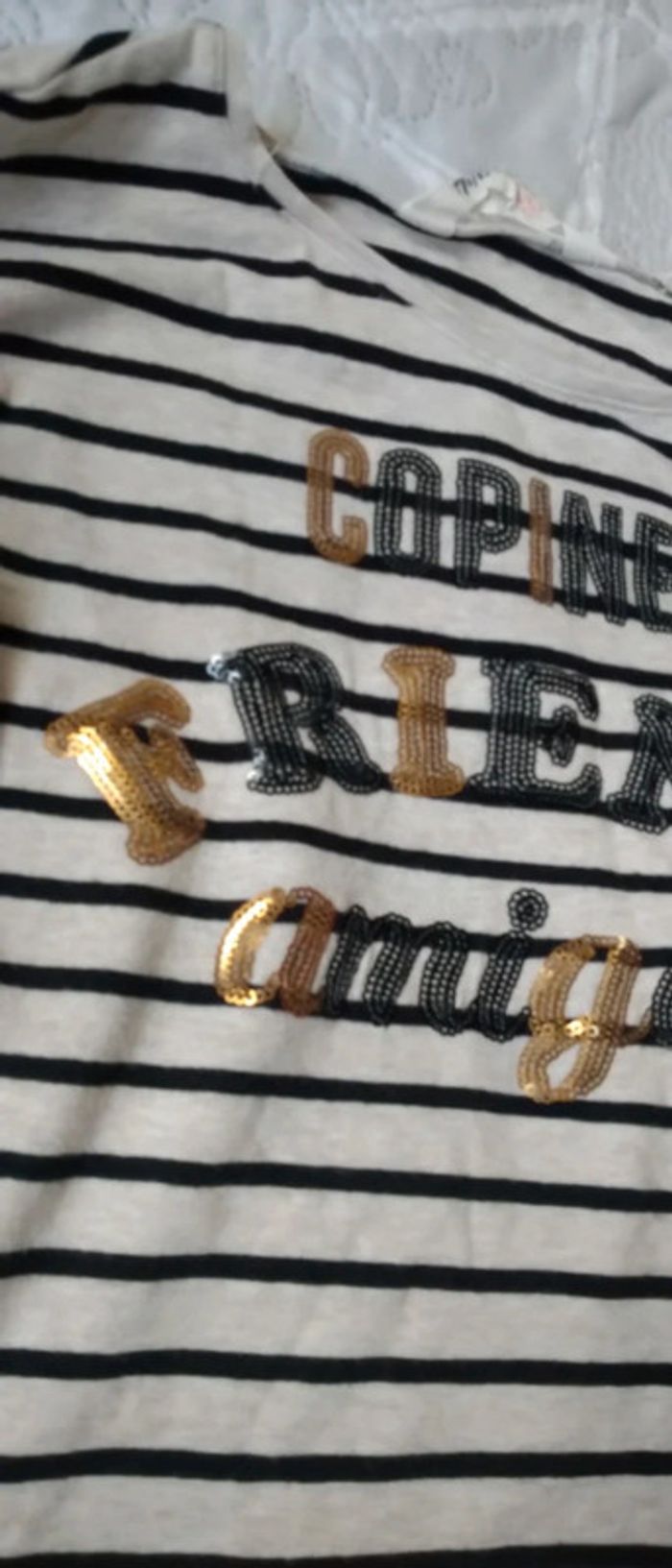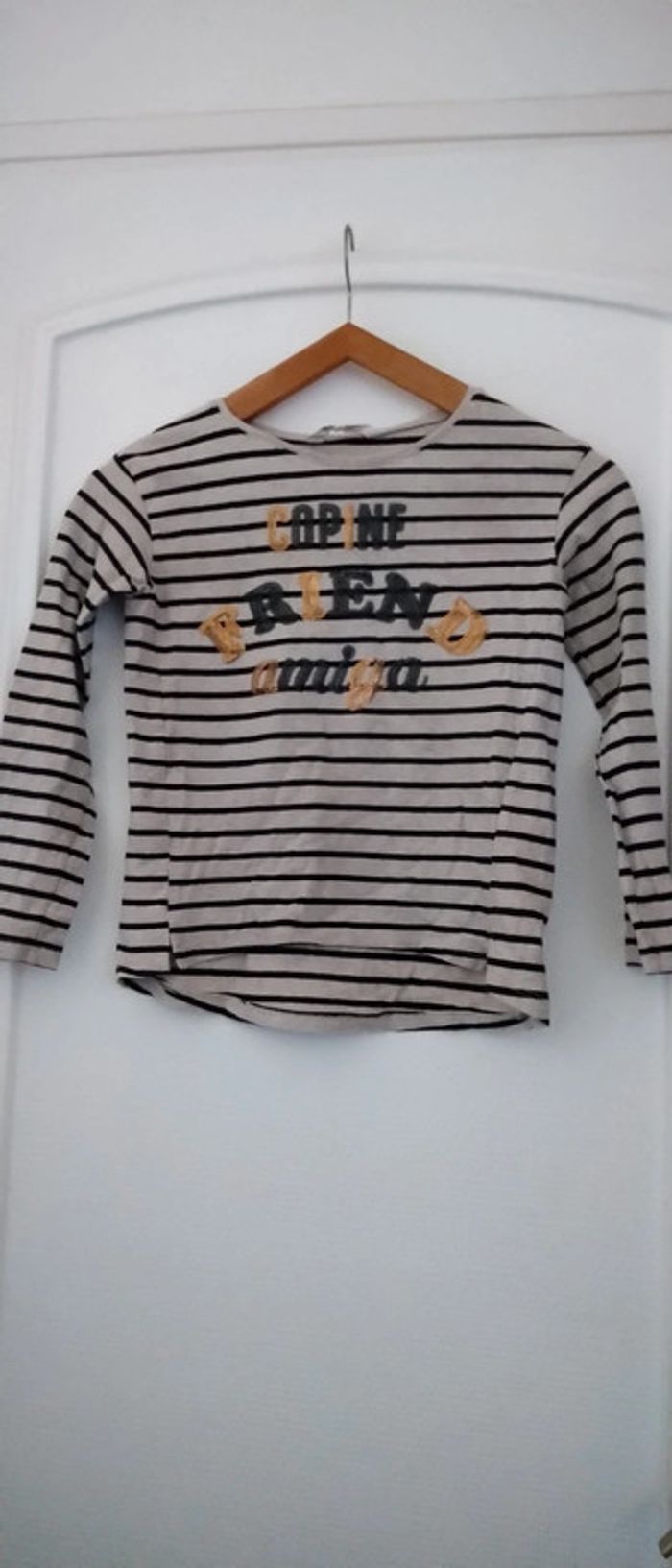 Tee-shirt manches longues en coton et elastanne avec rayures beiges grisé et noir texte en sequins sur le devant plus court devant que derrière longueur 44 cm devant 49 cm derrière largeur épaules 37 cm longueur manches 41 cm très peu porté en très bon état n hésitez pas à faire un lot dans mon dressing pour bénéficier d une réduction #midole #midoleenfant #fille #fille7ans #hm #sequin #rayures