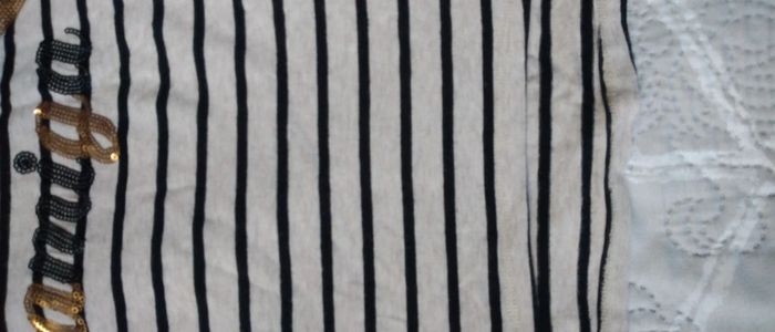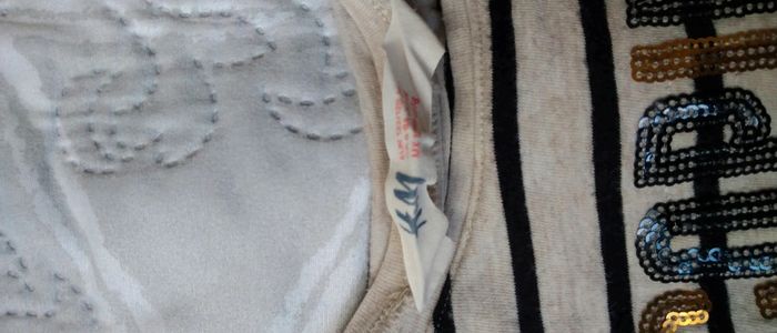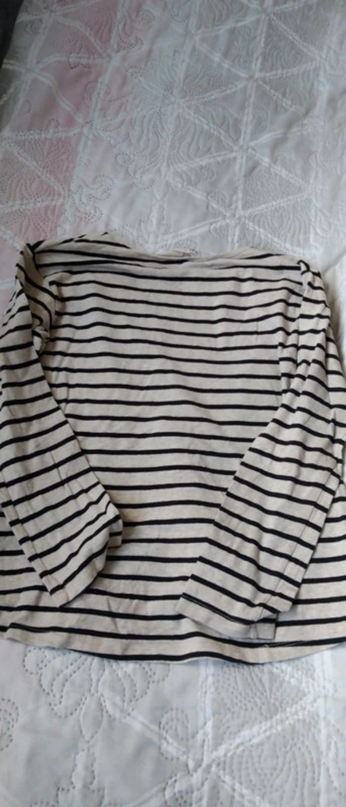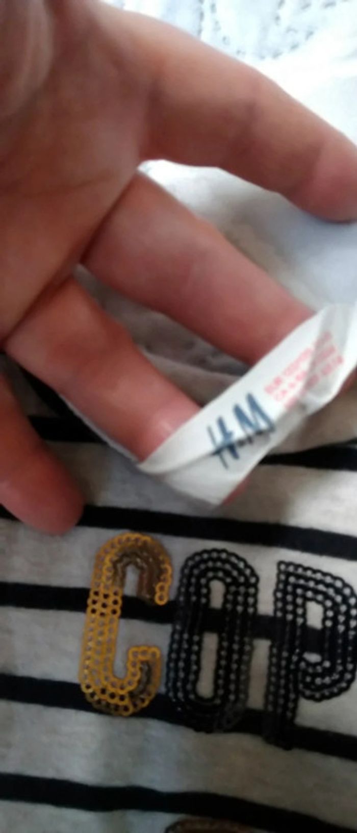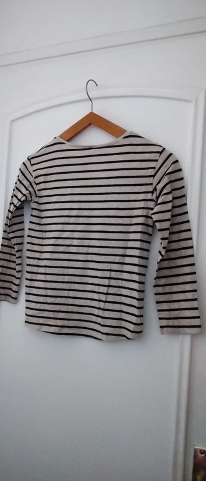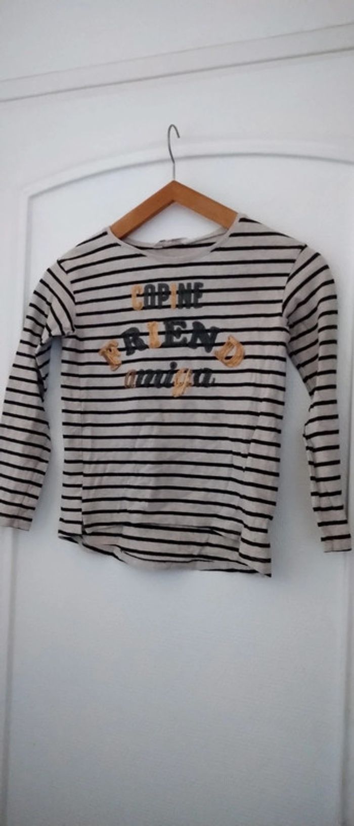 Tee-shirt manches longues en coton et elastanne avec rayures beiges grisé et noir texte en sequins sur le devant plus court devant que derrière longueur 44 cm devant 49 cm derrière largeur épaules 37 cm longueur manches 41 cm très peu porté en très bon état n hésitez pas à faire un lot dans mon dressing pour bénéficier d une réduction #midole #midoleenfant #fille #fille7ans #hm #sequin #rayures
