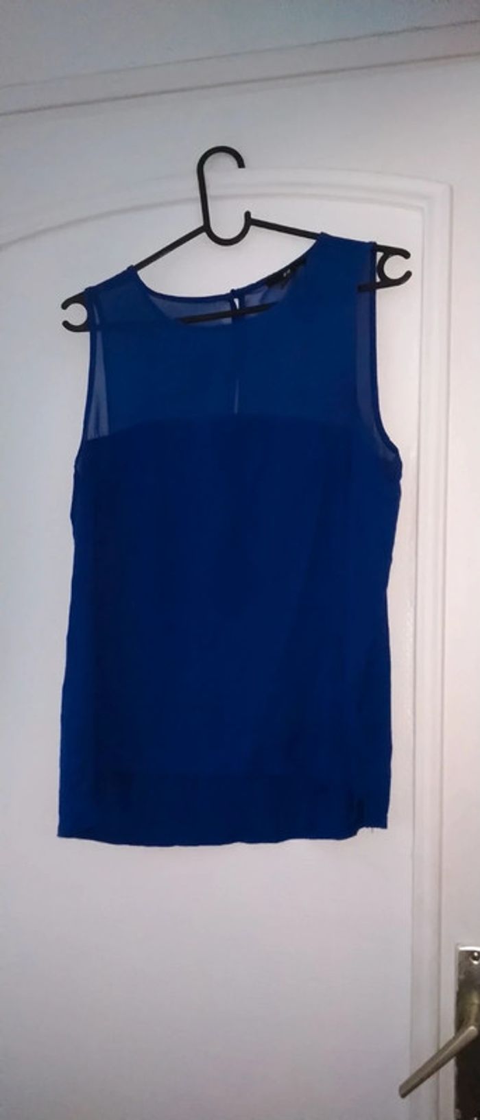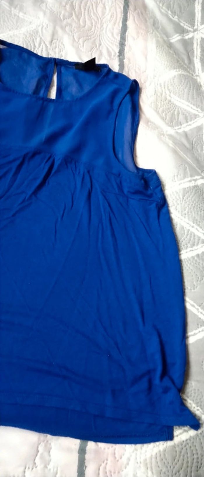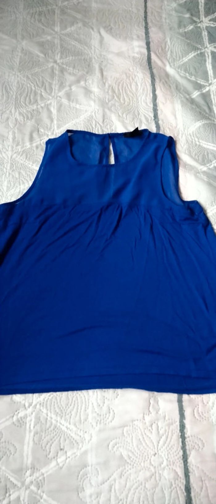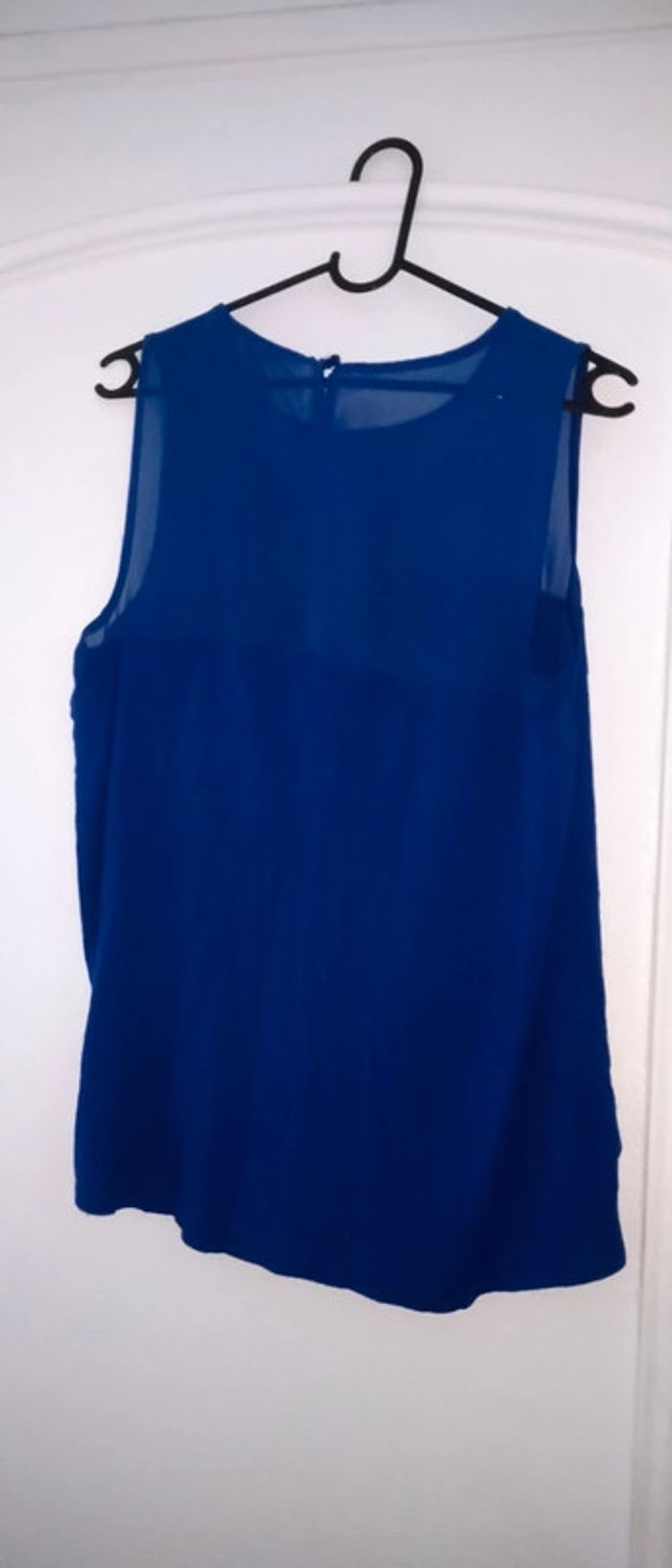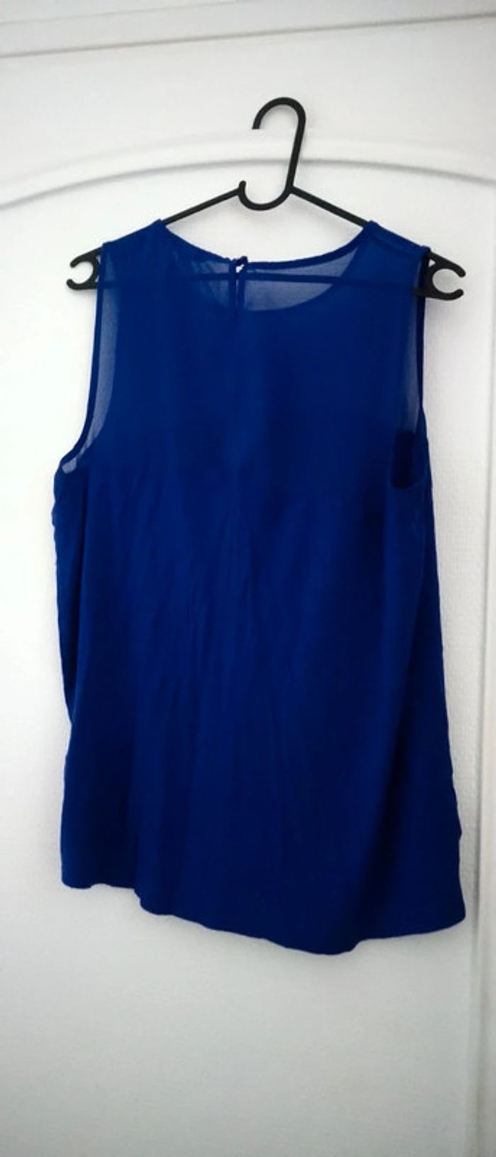 Haut sans manches bi matière en viscose et polyester aspect voile fermeture avec bouton goutte d eau au dos longueur 54 cm largeur aisselles à aisselles 47 cm et largeur épaules 30 cm idéal pour une soirée porté quelques fois en bon état ⚠️ juste quelques légères bouloches dues au lavage par endroit (voir dernières photos) n hésitez pas à faire un lot dans mon dressing pour bénéficier d une réduction