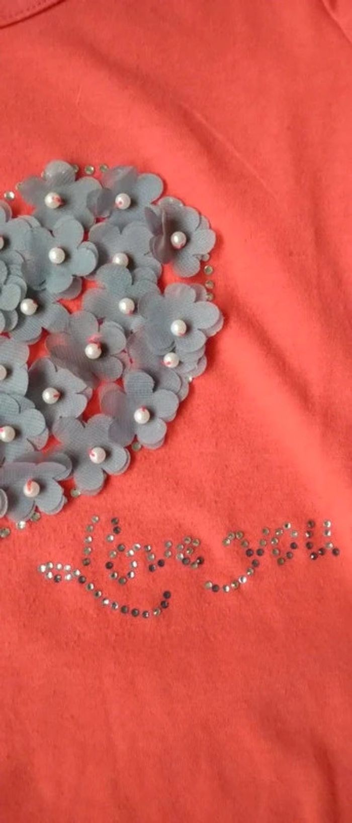 Tee-shirt en coton et elasthanne manches longues col rond motif cœur avec fleurs en tissus et perle strass avec texte i love you peu porté en bon état à part deux fleurs avec le fil un peu tiré col légèrement décousu qui peut être recousu longueur 60 cm largeur aisselles à aisselles 40 cm et largeur épaules 35 cm n hésitez pas à faire un lot dans mon dressing pour bénéficier d une réduction #midole #midolefemme38 #midolefemme #teeshirt #iloveyou #coeur #fleurs #strass #teeshirtaveccoeur #cachecache #femme38 #corail