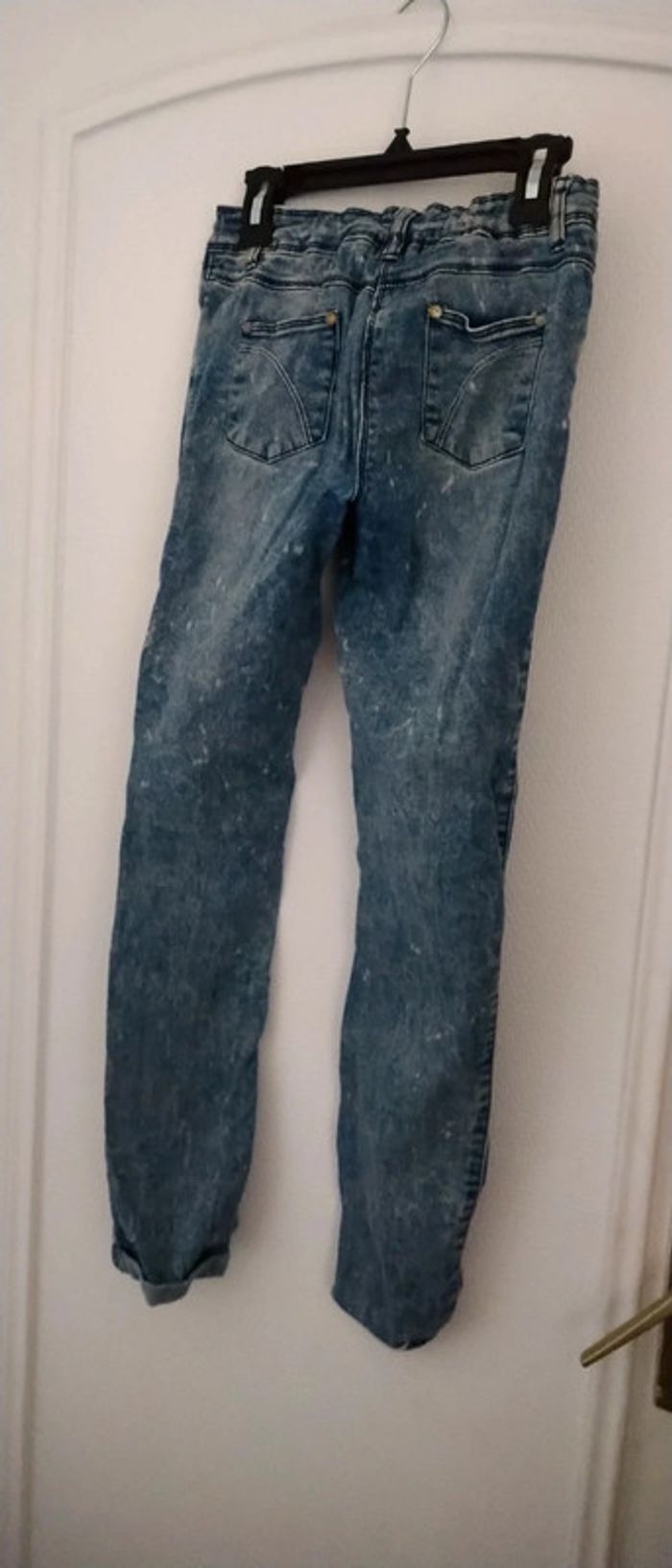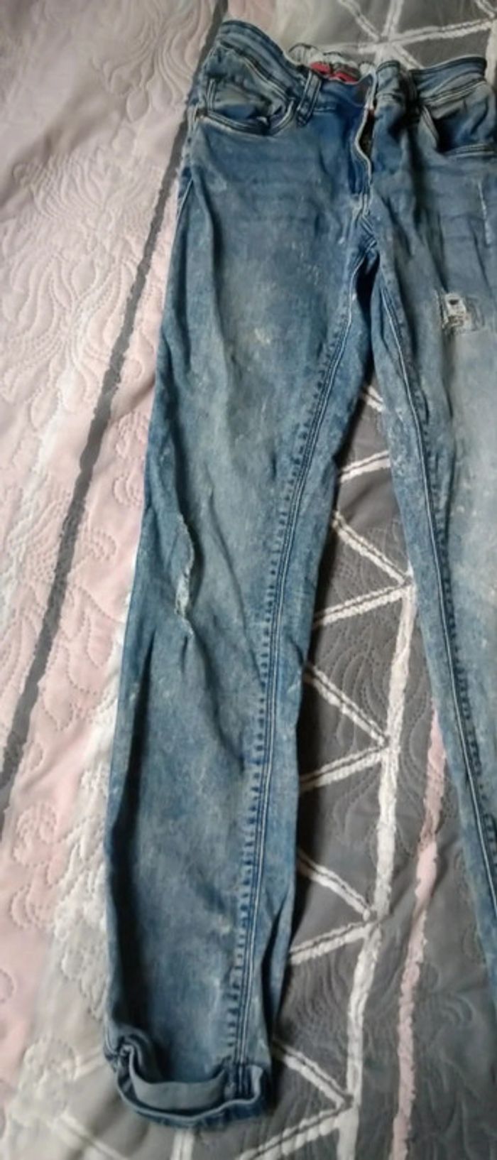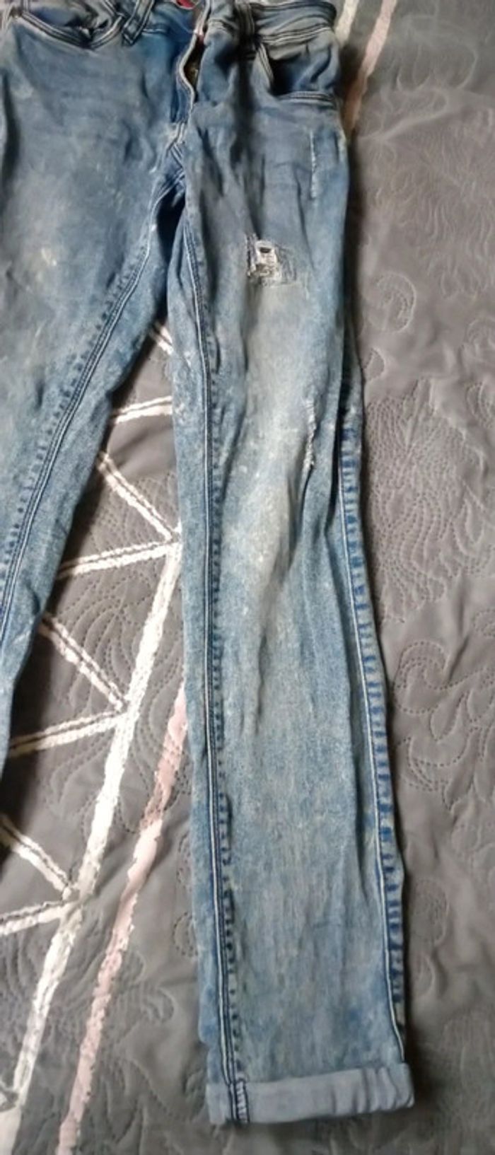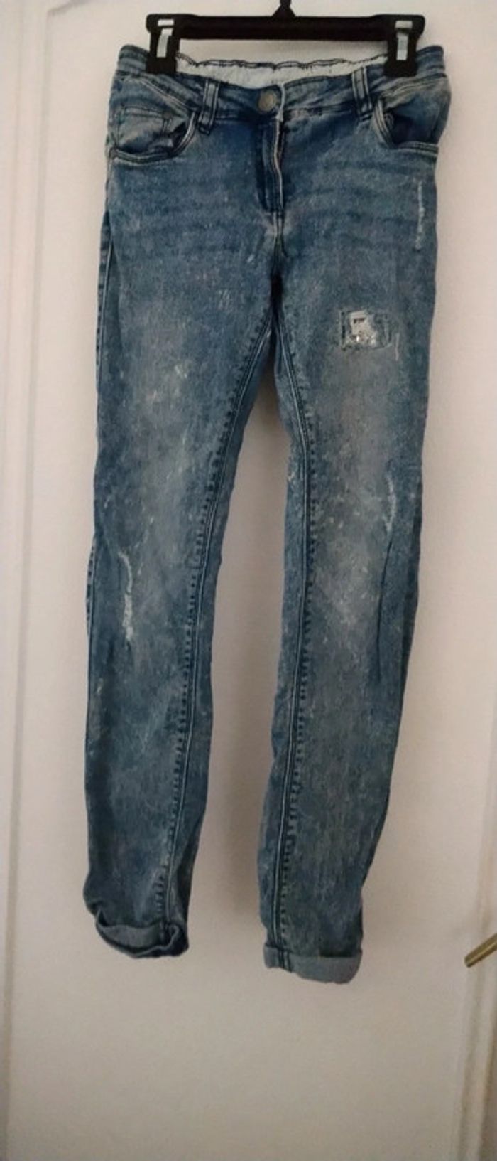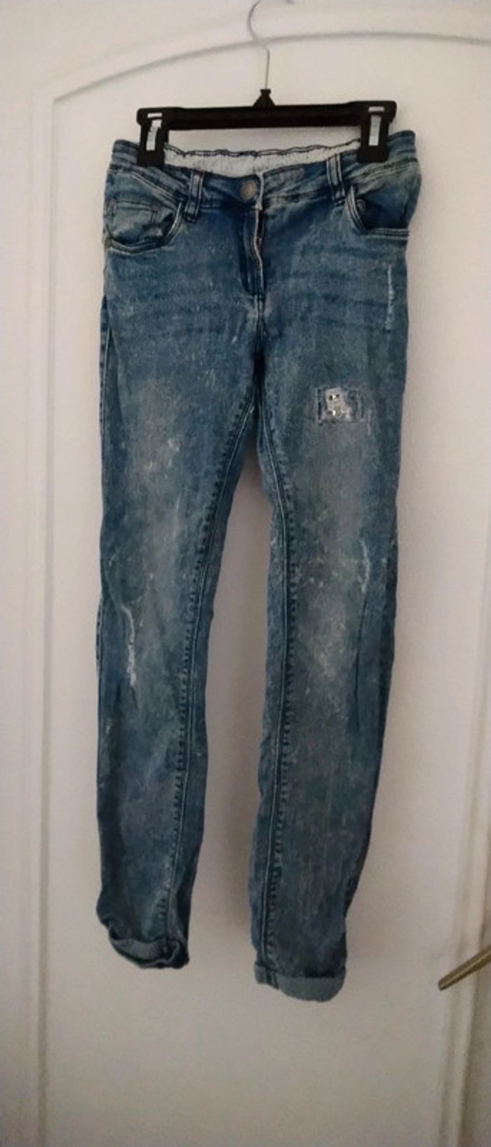 Jean fin coupe slim bleu bleached effet usé délavé et déchiré avec strass bas avec revers taille élastique longueur 85 cm largeur cuisses 17 cm largeur bas de jambe 12 cm très peu porté en très bon état n hésitez pas à faire un lot dans mon dressing pour bénéficier d une réduction #midole #midoleenfant #midolefille10ans #midolefille #jean #jeanslim #effetuse #delave #jeandechire #orchestra #fille10ans #rentreedesclasses #midolerentrée