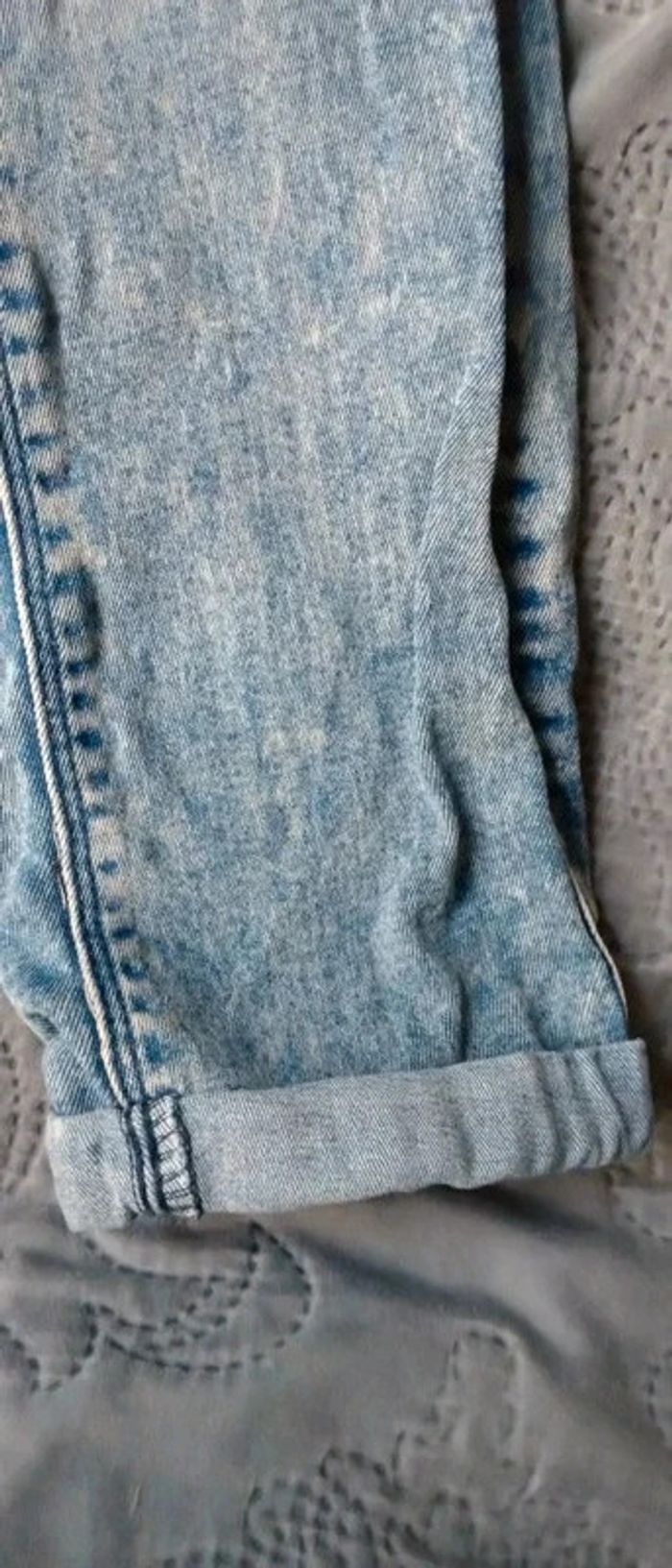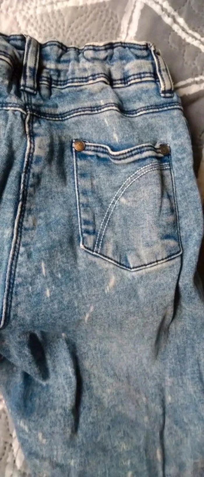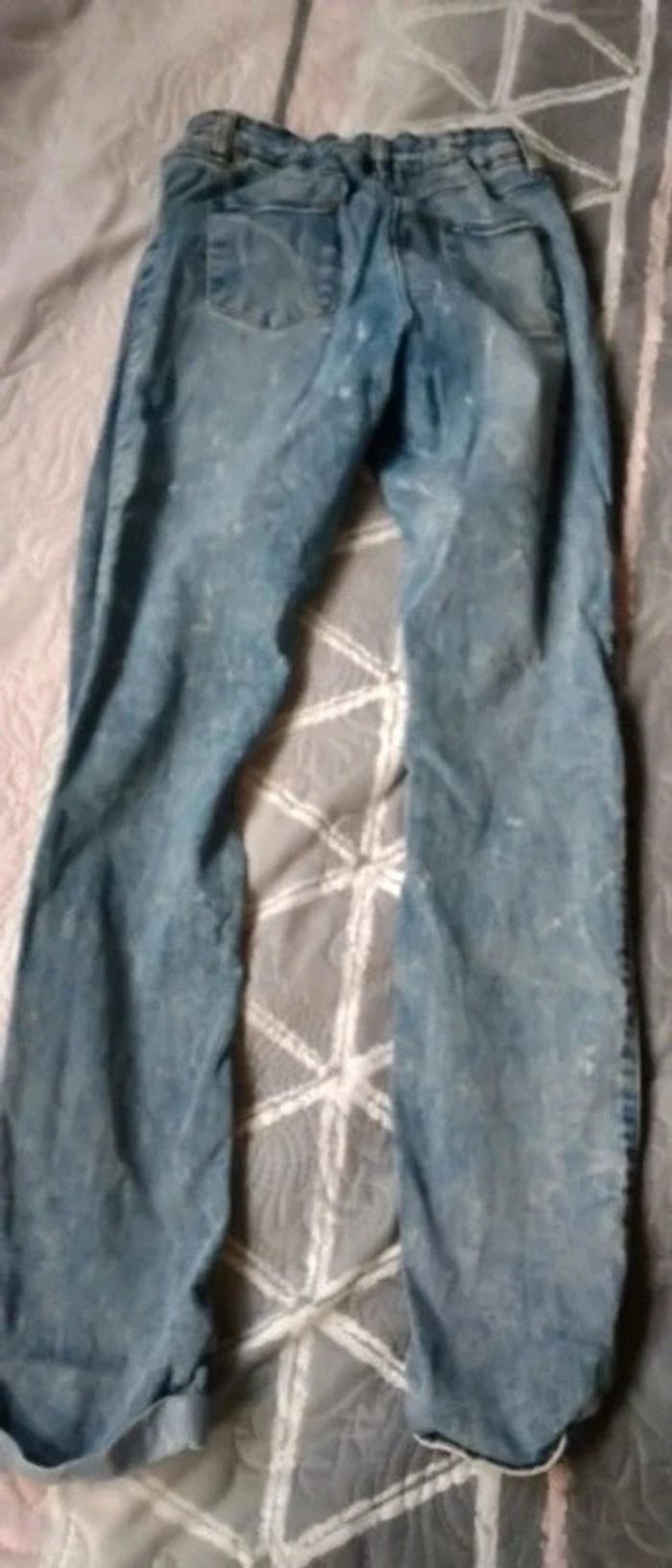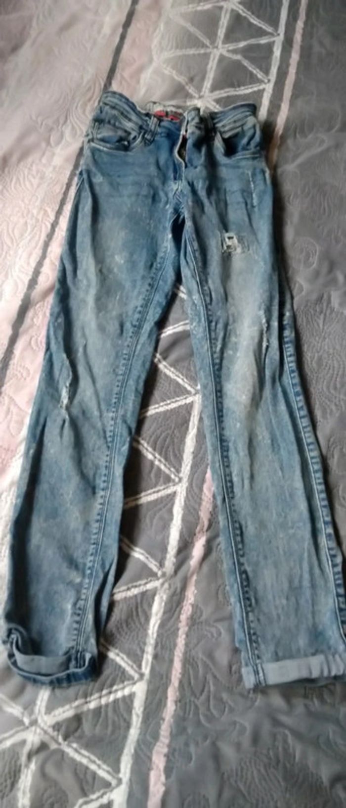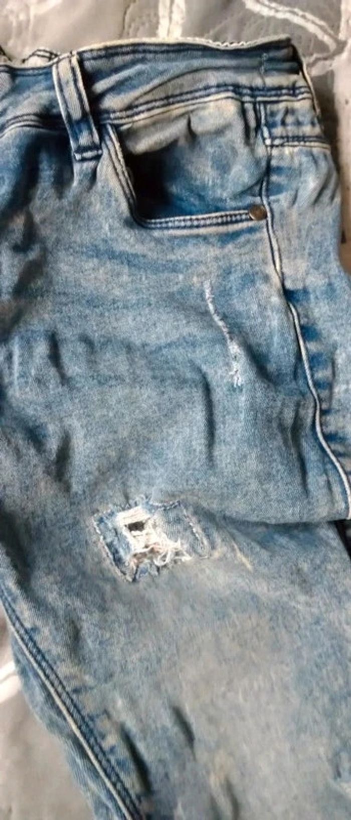 Jean fin coupe slim bleu bleached effet usé délavé et déchiré avec strass bas avec revers taille élastique longueur 85 cm largeur cuisses 17 cm largeur bas de jambe 12 cm très peu porté en très bon état n hésitez pas à faire un lot dans mon dressing pour bénéficier d une réduction #midole #midoleenfant #midolefille10ans #midolefille #jean #jeanslim #effetuse #delave #jeandechire #orchestra #fille10ans #rentreedesclasses #midolerentrée