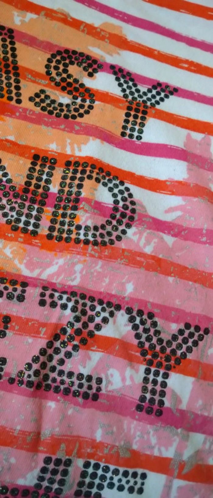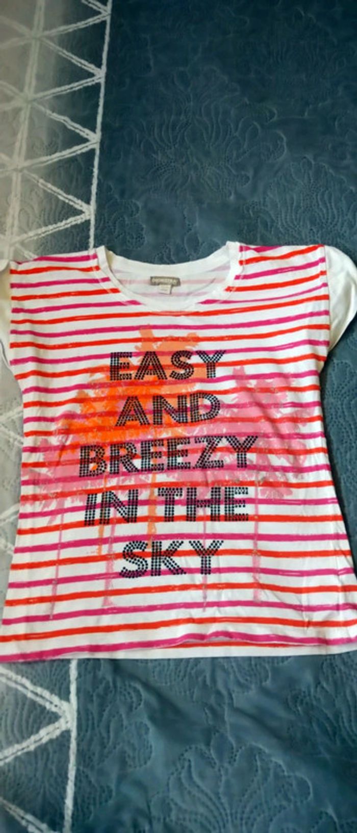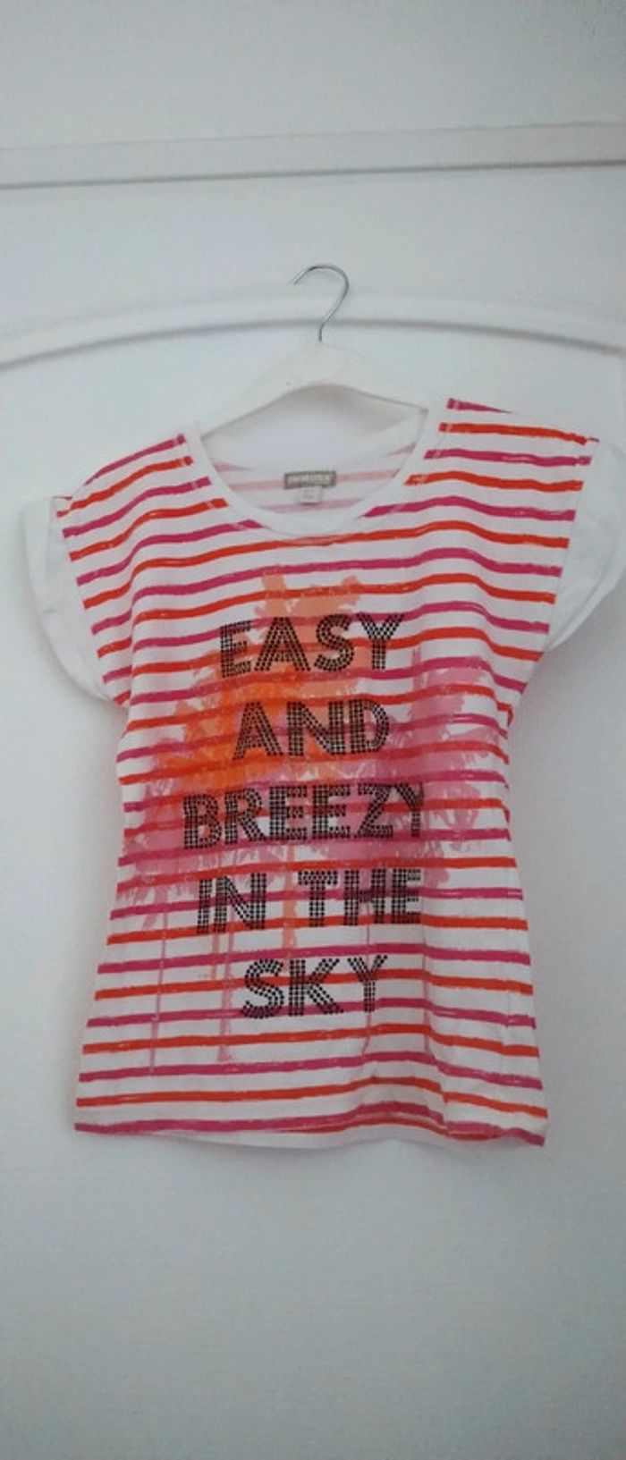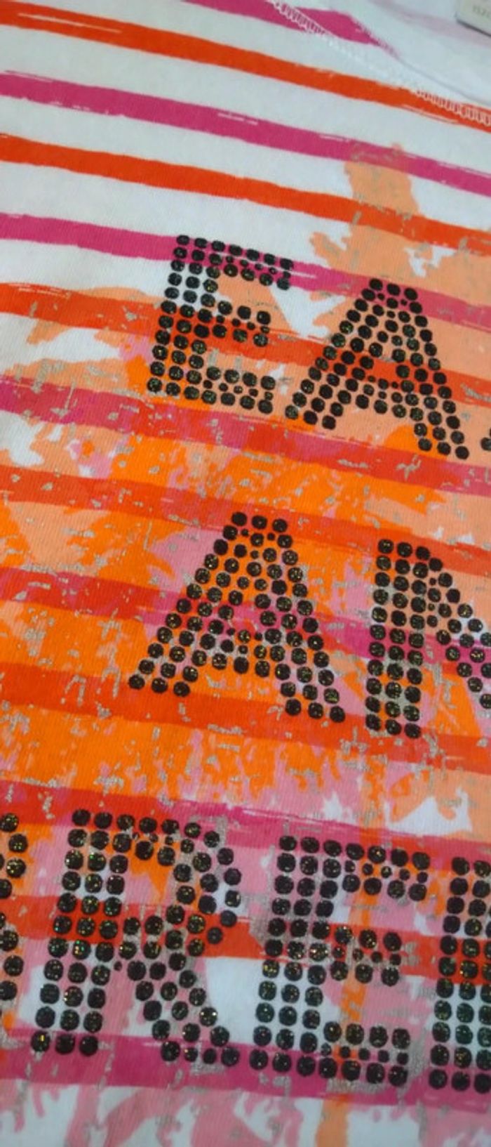Tee shirt manches très courtes avec pli en coton rayures effet effacé texte en clous noirs scintillants très coloré rose et orange idéal pour les beaux jours très peu porté en très bon état longueur 48 cm largeur aisselles à aisselles 38 cm n hésitez pas à faire un lot dans mon dressing pour bénéficier d une réduction #midole #midoleenfant #midolete #midolefille #midolefille12ans #hautété #mariniere #rayures #hautetefille12ans #orchestra #rose #orange #clou #ete #orchestrafille #filleété #fille12ans #orchestra12ans