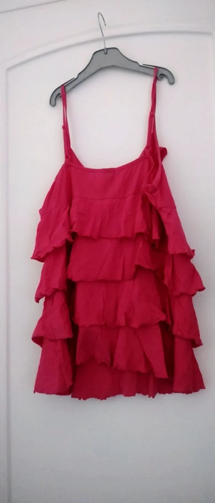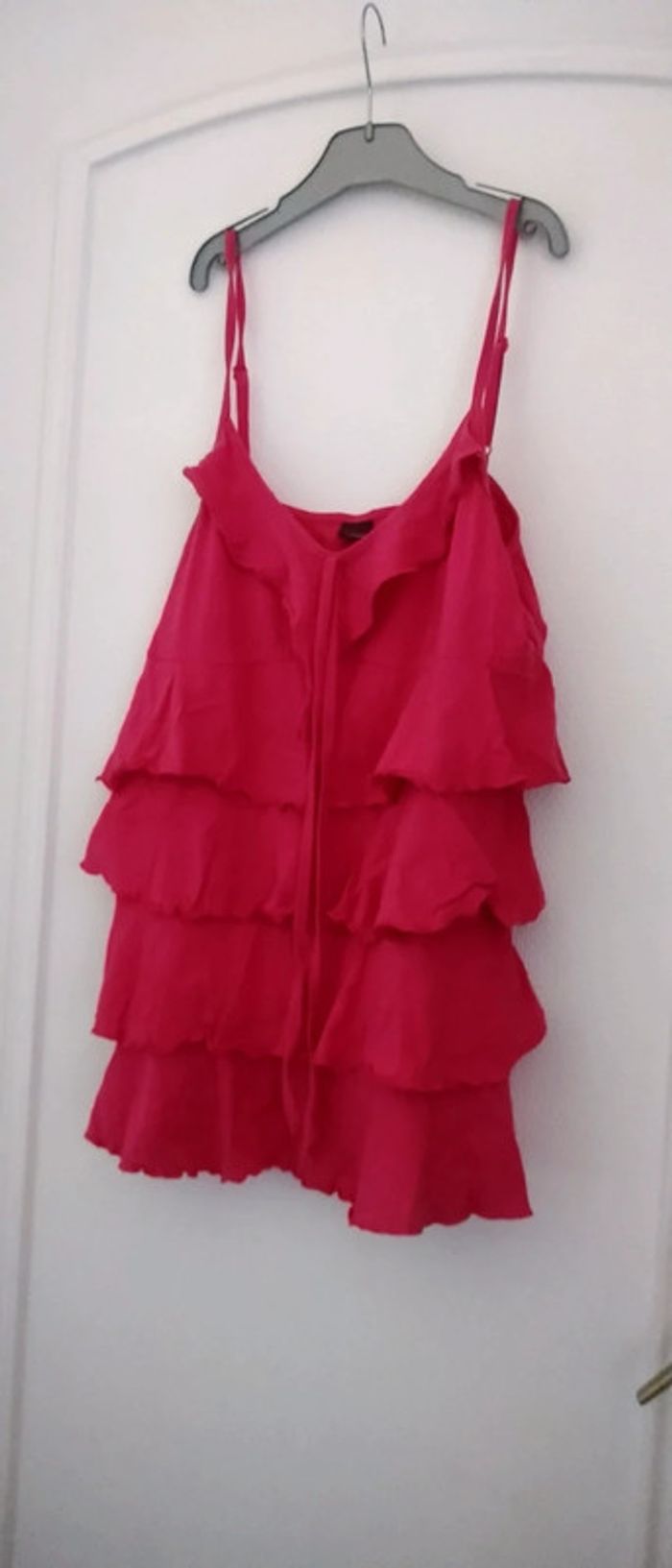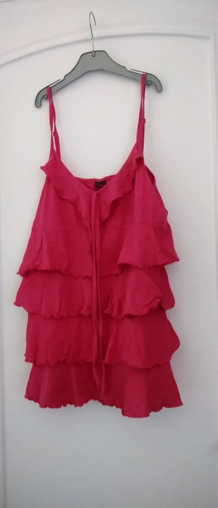 Haut à fines bretelles réglables avec superposition de volants lien au niveau de la poitrine couleur rose fuschia en coton extensible idéal pour les beaux jours longueur 66 cm largeur aisselles à aisselles 45 correspond à un grand 42 jamais porté état neuf n hésitez pas à faire un lot dans mon dressing pour bénéficier d une réduction #midole #midolete #debardeur #debardeuravolants #midolefemme #midolefemme44 #midolefemme42 #hautavolants #fushia #rose #blancheporte #neuf #hautfemmeete #hautabretelles #hautfemme42