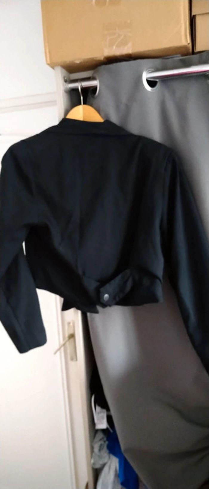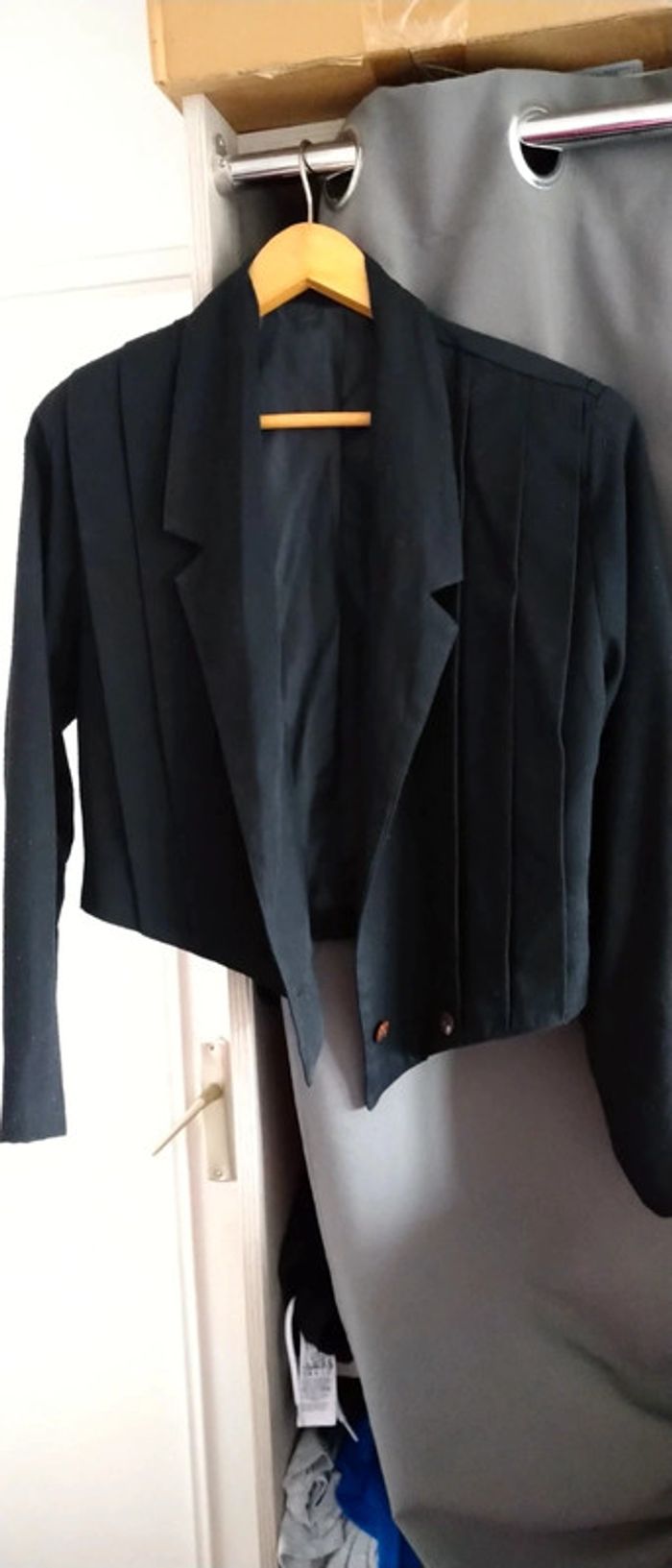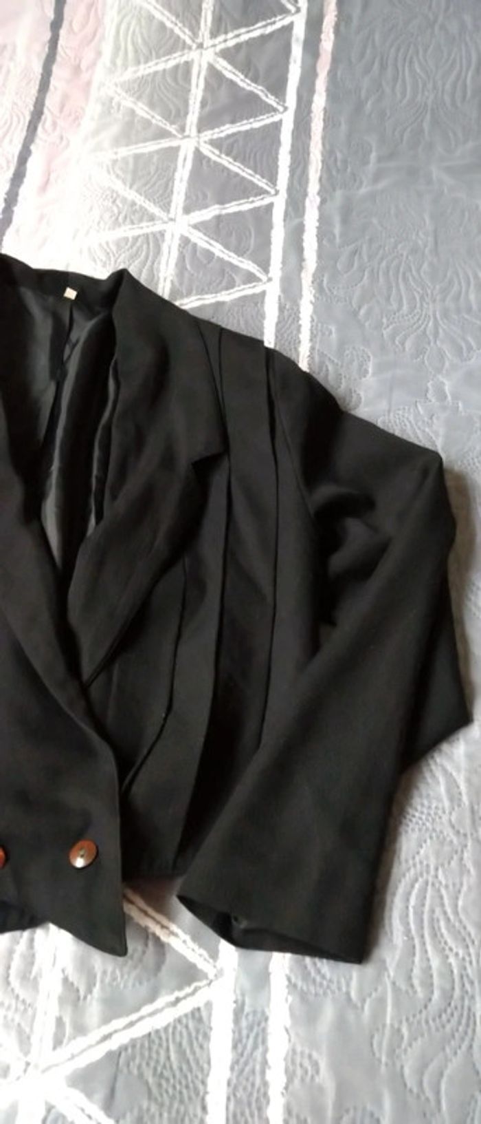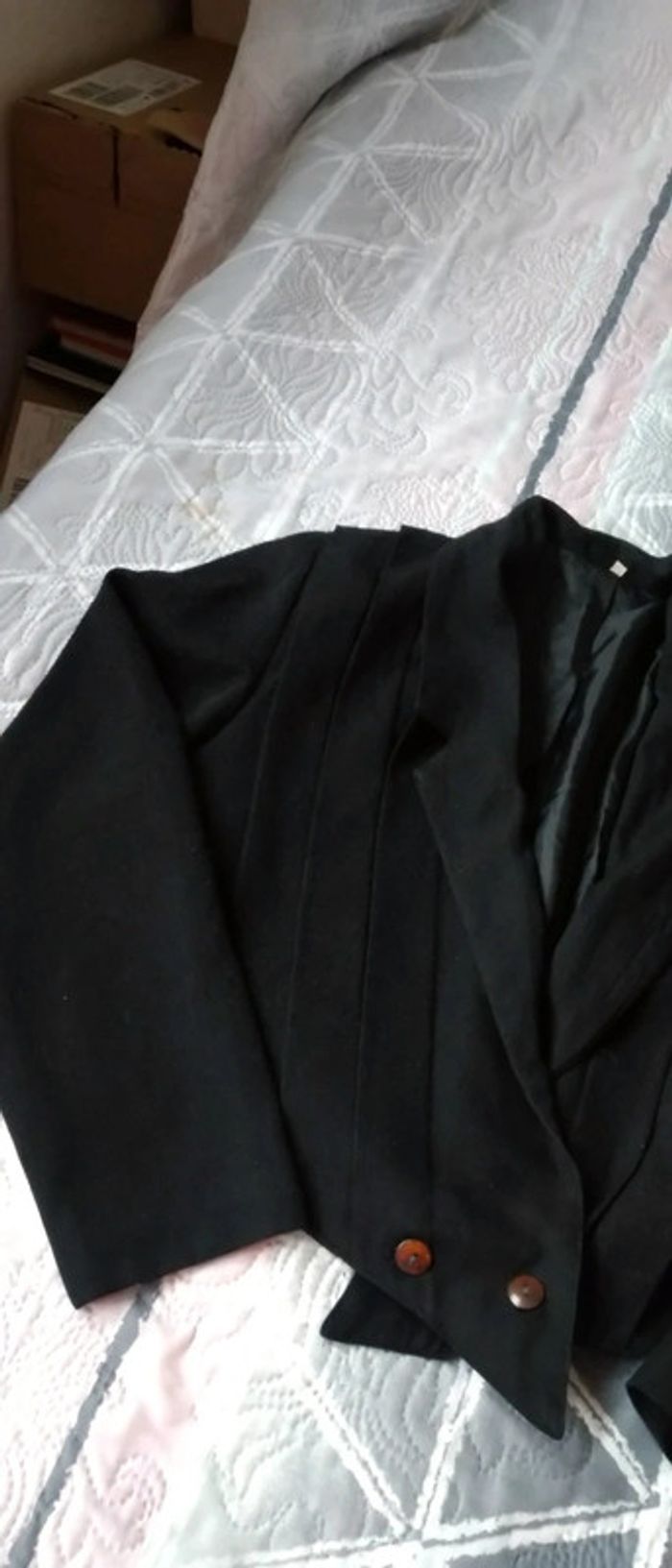 Veste courte Spencer vintage achetée dans les années 90 avec épaulettes en coton et viscose boutonnée avec deux boutons peut se porter ouverte ou fermer plis sur le devant forme asymétrique plus long devant que derrière bouton derrière doublure polyester achetée dans un magasin d articles de mariage idéale pour une grande occasion portée quelques fois en très bon état à part quelques très légères bouloches dues au lavage taille petit peut convenir à un 36 largeur aisselles à aisselles 49 cm largeur épaules à épaules 40 cm longueur 54 cm devant et 47 cm derrière #midolefemme #midolefemme36 #midolefemme38 #midole #Spencer #veste #blazer #vestevintage #annees90 #vesteannée90 #90 #epaulettes #noir #grandeoccasion #mariage
