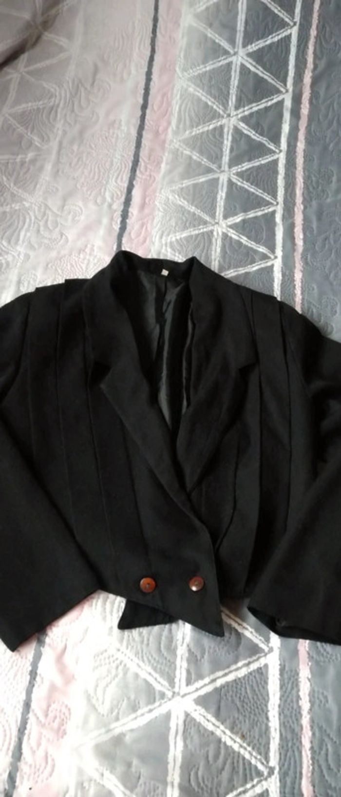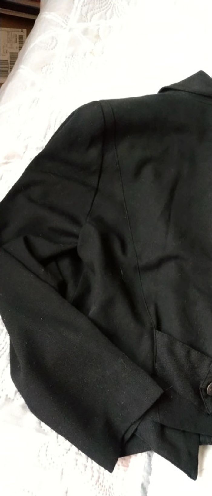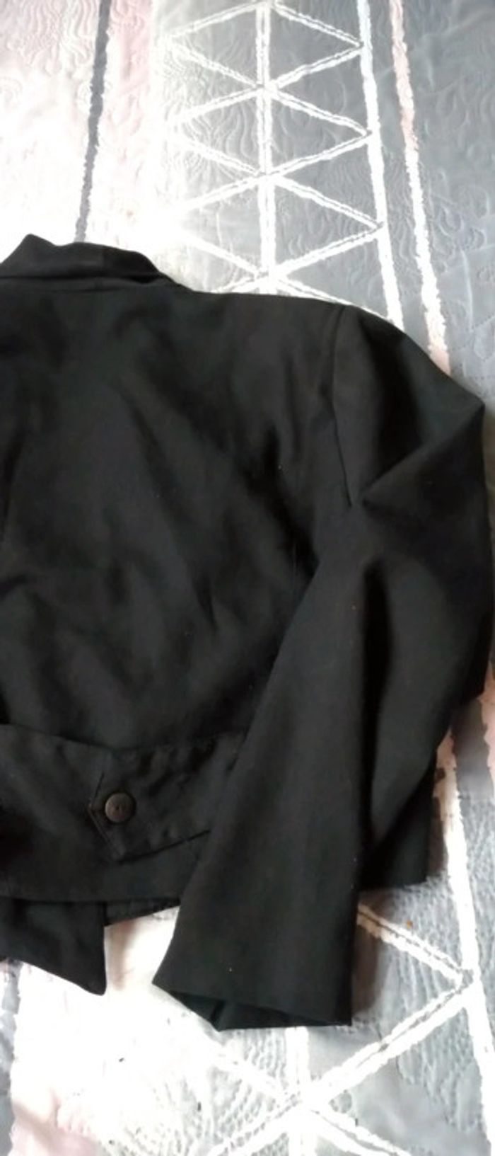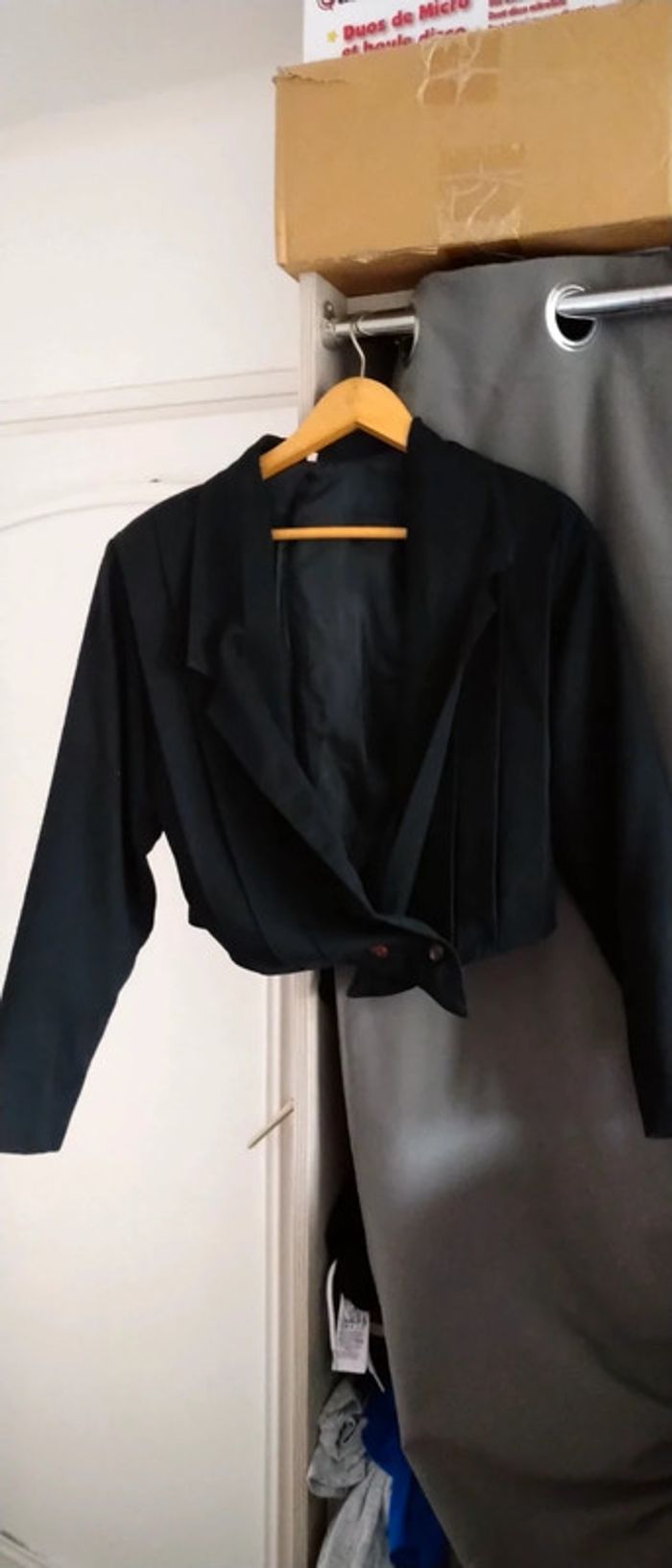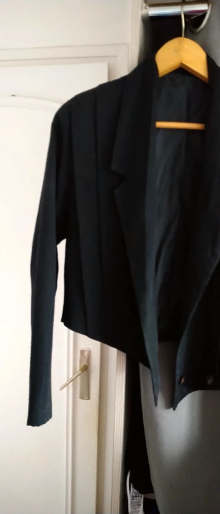 Veste courte Spencer vintage achetée dans les années 90 avec épaulettes en coton et viscose boutonnée avec deux boutons peut se porter ouverte ou fermer plis sur le devant forme asymétrique plus long devant que derrière bouton derrière doublure polyester achetée dans un magasin d articles de mariage idéale pour une grande occasion portée quelques fois en très bon état à part quelques très légères bouloches dues au lavage taille petit peut convenir à un 36 largeur aisselles à aisselles 49 cm largeur épaules à épaules 40 cm longueur 54 cm devant et 47 cm derrière #midolefemme #midolefemme36 #midolefemme38 #midole #Spencer #veste #blazer #vestevintage #annees90 #vesteannée90 #90 #epaulettes #noir #grandeoccasion #mariage