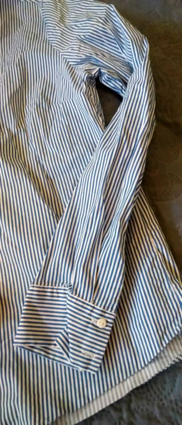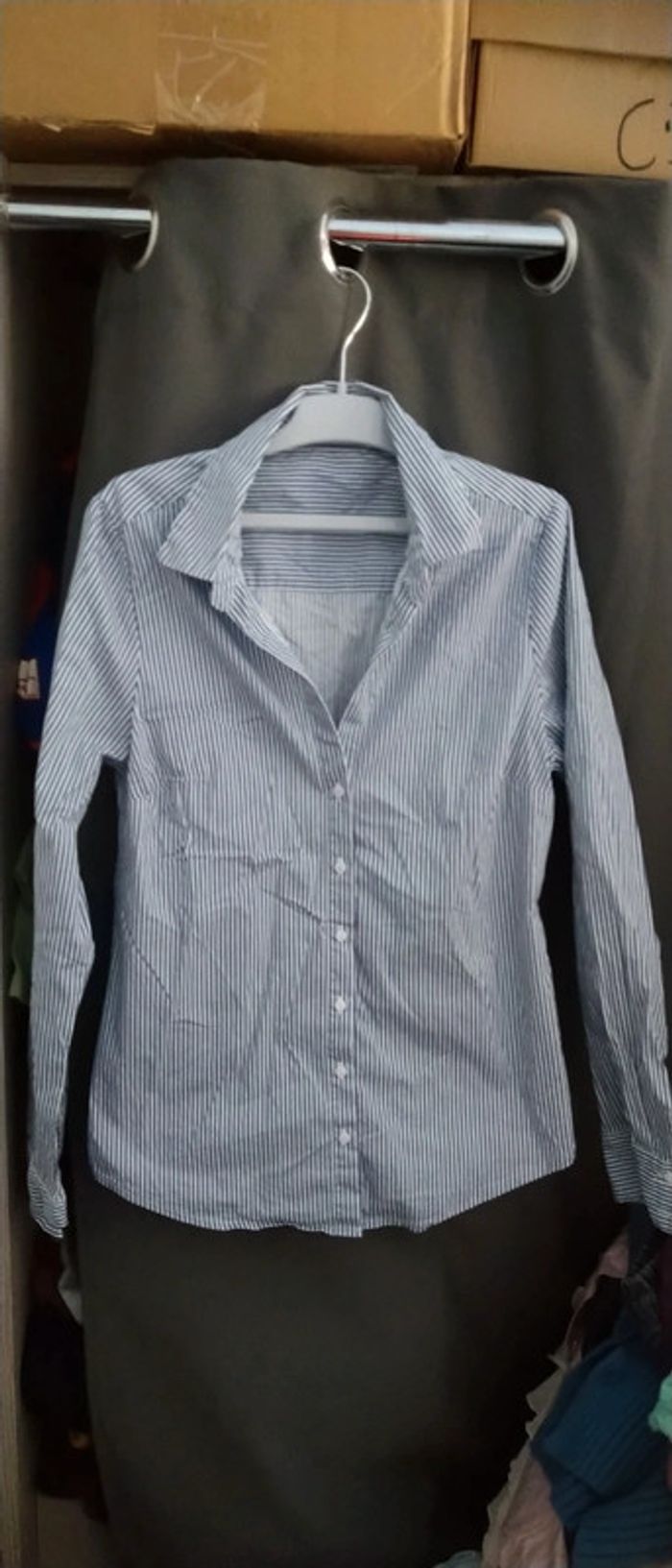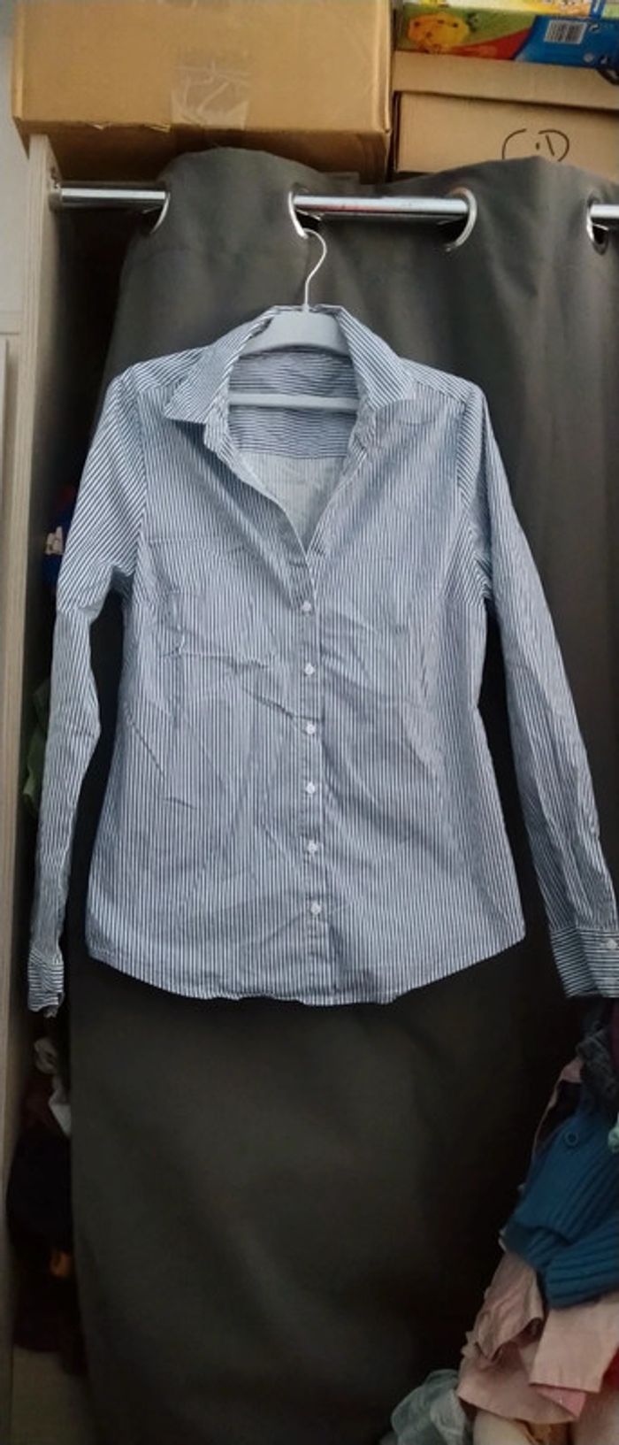 Chemisier en coton et elastanne col ouvert en V rayures bleues et blanches coupe cintrée resserrée à la taille jamais porté état neuf avec bouton de rechange taille S correspondant à un 36 N hesitez pas à faire un lot dans mon dressing pour bénéficier d une réduction #midolefemme #midole #midolefemme36 #jennyfer #chemise #chemisier #chemiseàrayures #36 #S