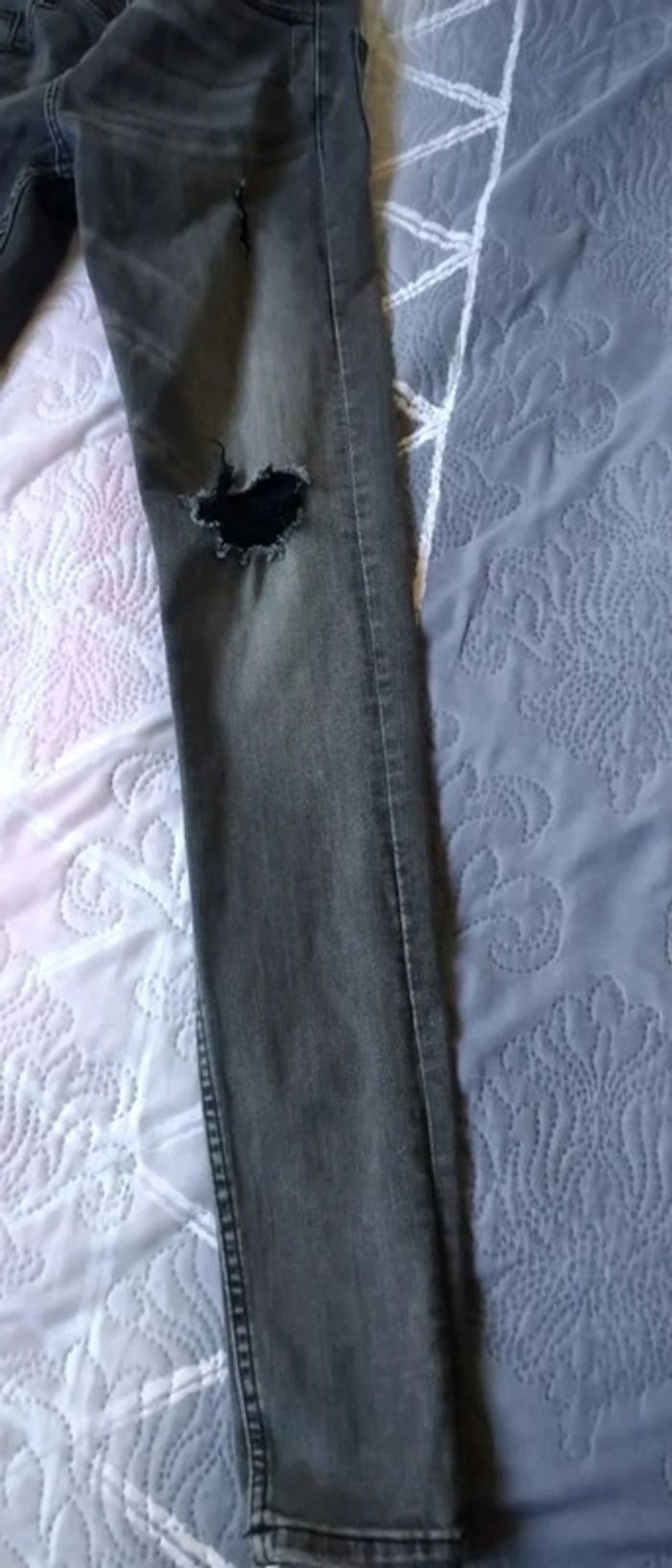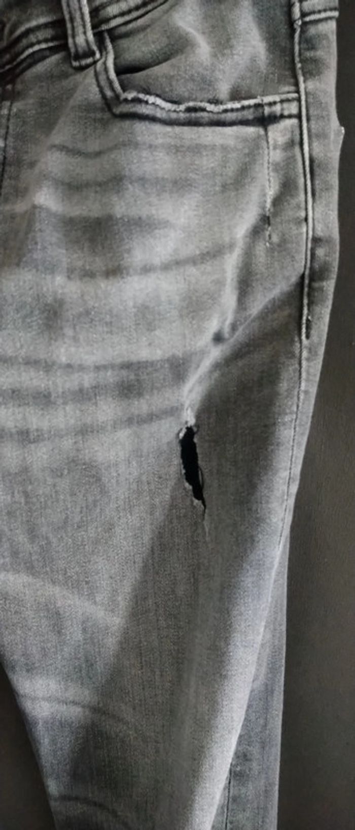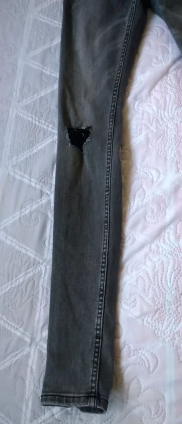 Jean skinny fit très étroit effet usé avec trous sur le devant extensible et stretch avec elasthane gris délavé longueur jambe 98 cm largeur cuisses 19 cm bas de jambes 11 cm Très peu porté en excellent état correspond à une taille 13/14 ans #jean #slim #jeanskinnyfit14ans #skinny #jeanslim #jeanslimgarçon14ans #garçon #14ansgarcon #14ans #garçon #midole #midolegarçon14ans #midolegarçon