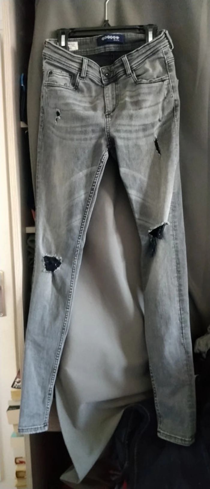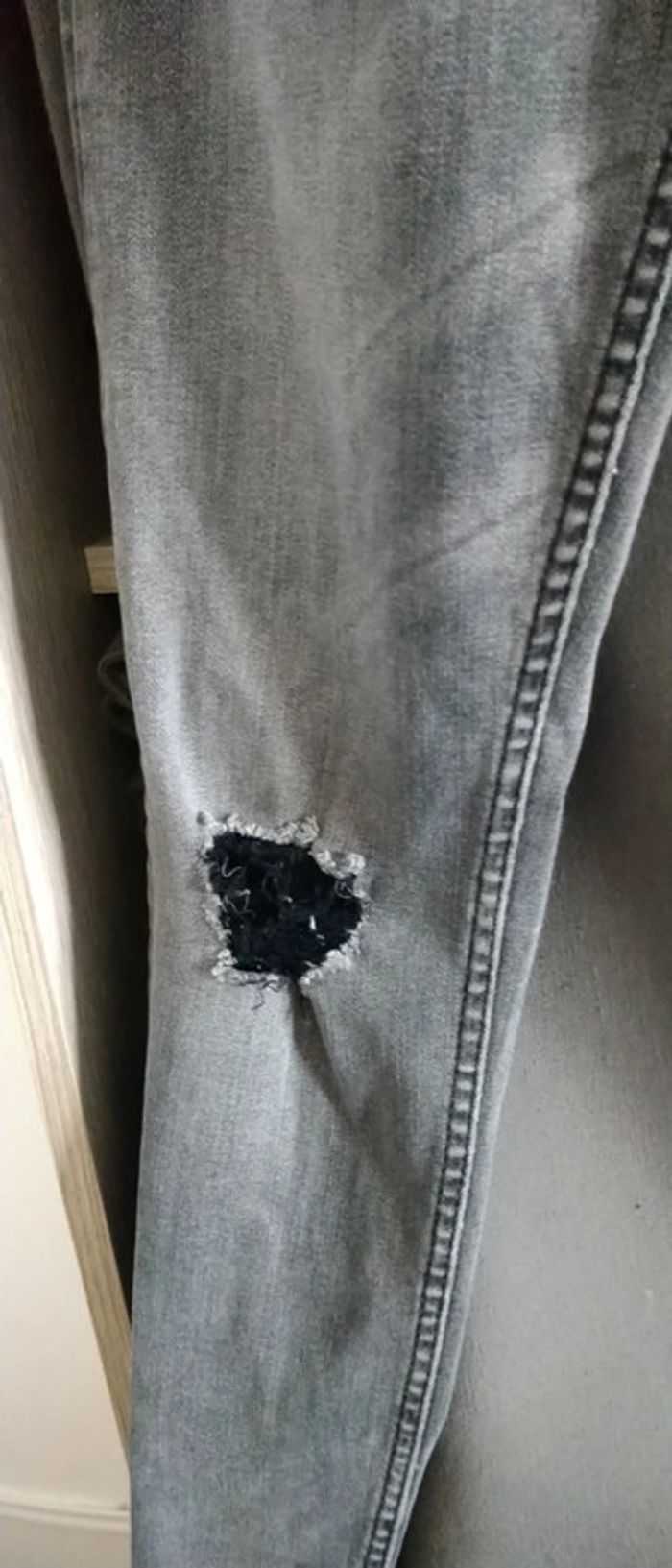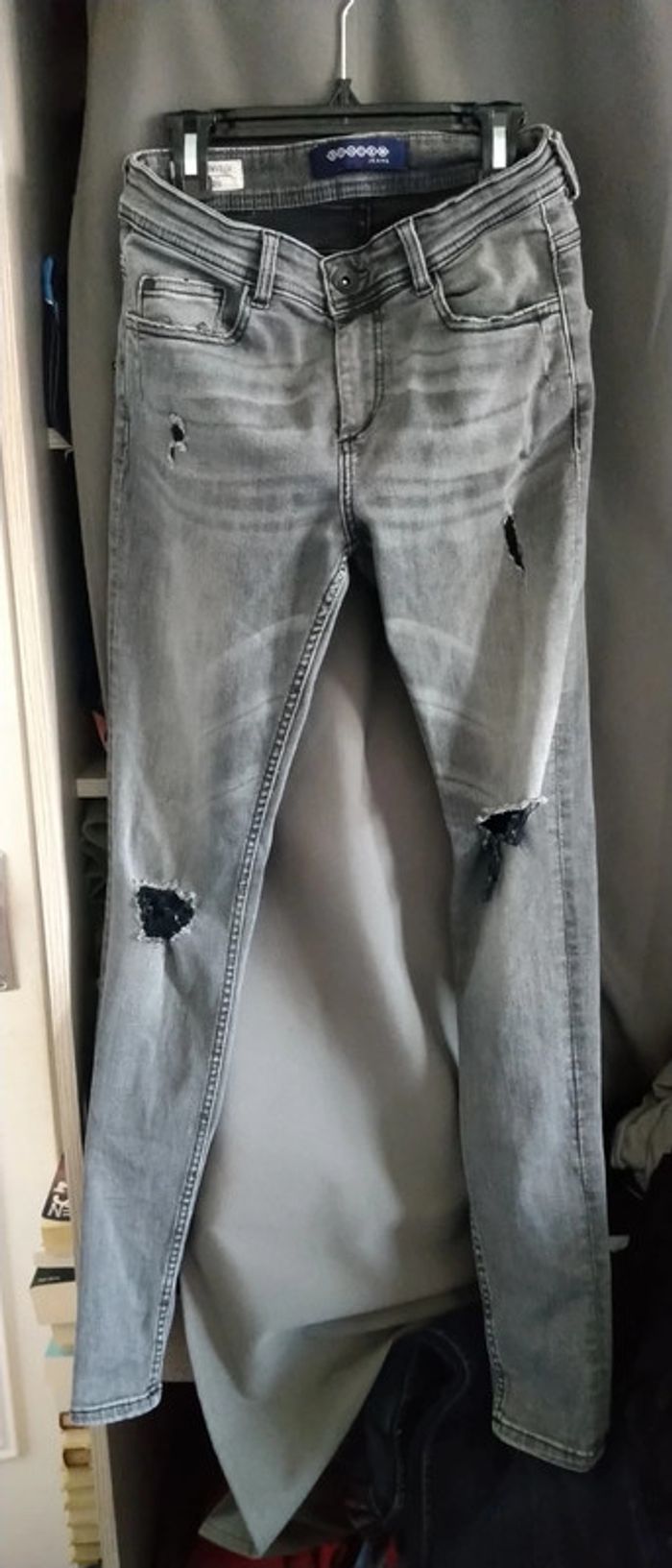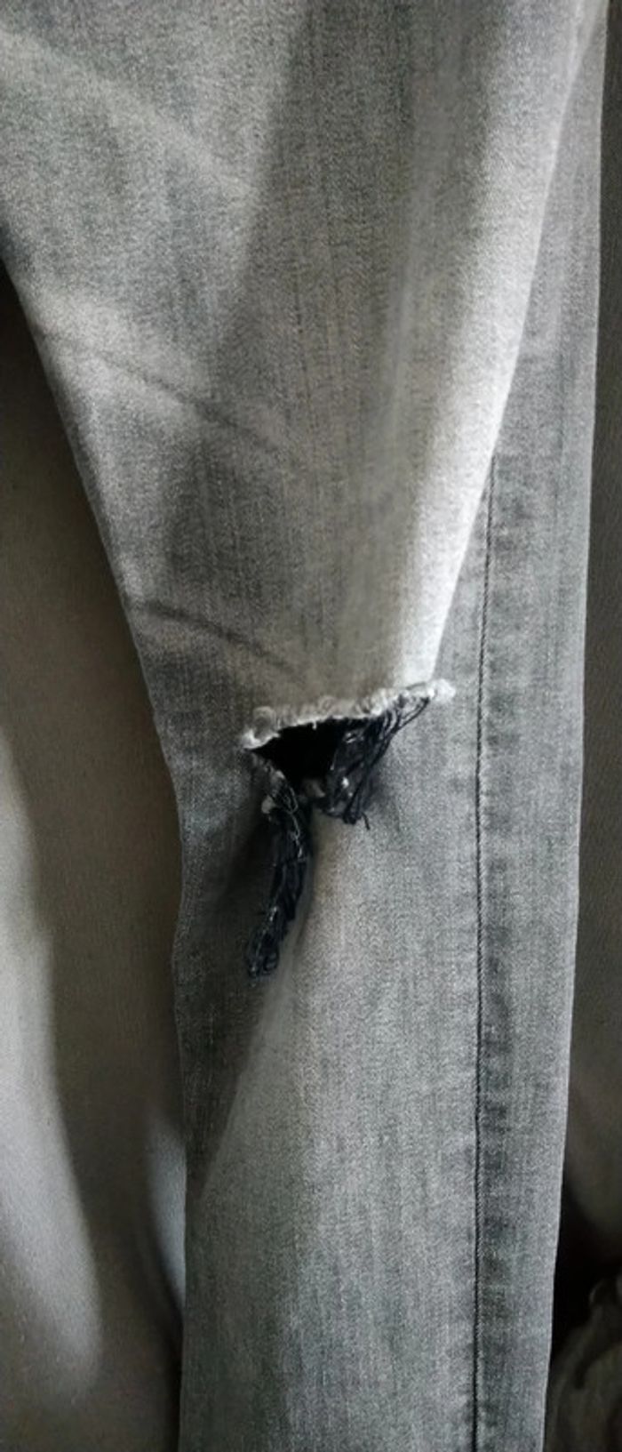 Jean skinny fit très étroit effet usé avec trous sur le devant extensible et stretch avec elasthane gris délavé longueur jambe 98 cm largeur cuisses 19 cm bas de jambes 11 cm Très peu porté en excellent état correspond à une taille 13/14 ans #jean #slim #jeanskinnyfit14ans #skinny #jeanslim #jeanslimgarçon14ans #garçon #14ansgarcon #14ans #garçon #midole #midolegarçon14ans #midolegarçon