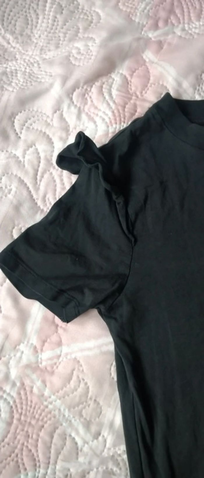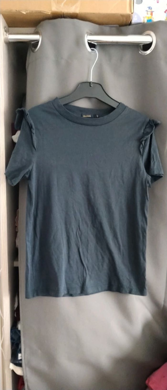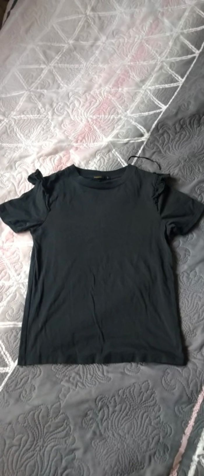 Tee-shirt manches courtes avec frous frous au niveau des épaules gris anthracite matière strech confortable très peu porté en excellent état #teeshirt #fille #femme #haut #frousfrous #xs #bizzbee