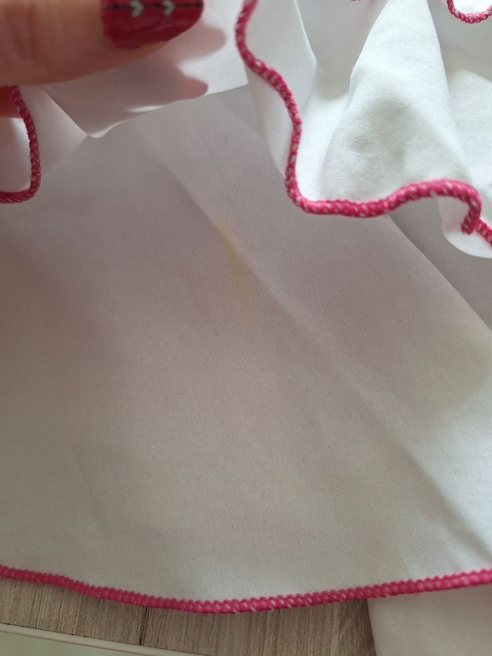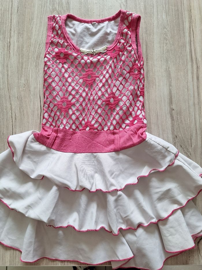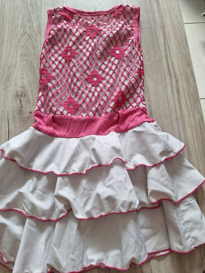 Très jolie robe blanche et rose En bon état juste une petite tâche sous l'un des volants Taille 6 ans