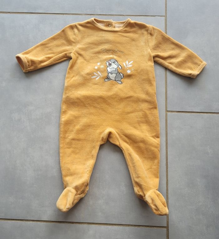 Pyjama en velours, de couleur moutarde avec motifs, de la marque Disney, taille 6 mois, en très bon état. Article lavé pour la vente.