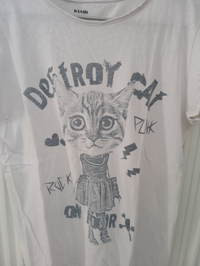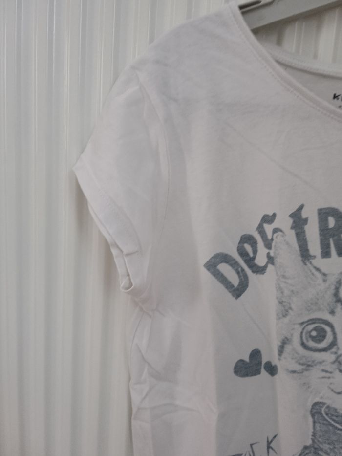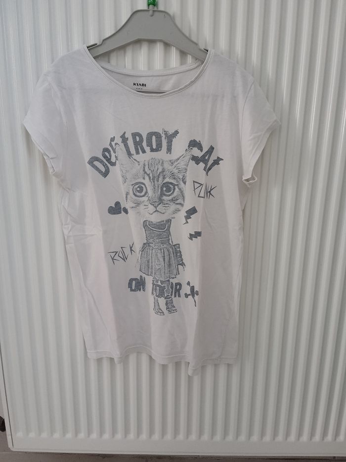 T-shirt manches courtes couleur blanc motif chat. Col rond. Taille 12 ans. Marque Kiabi. #fille12ansnade3033