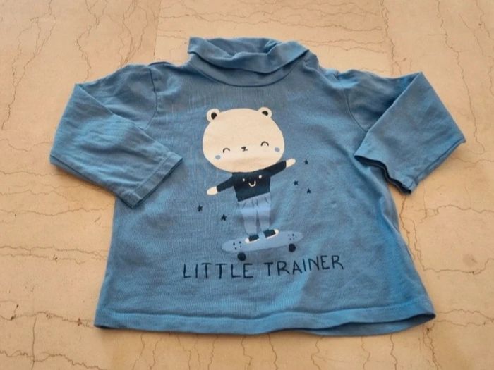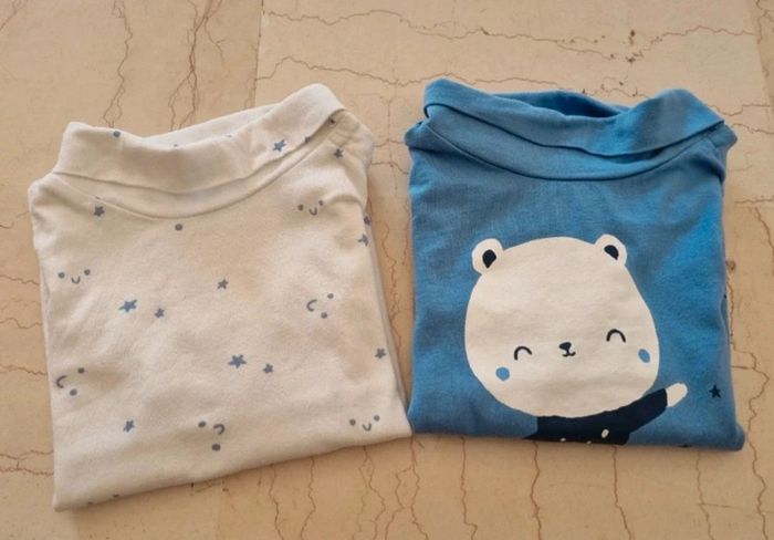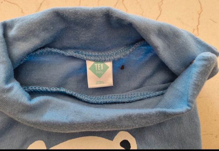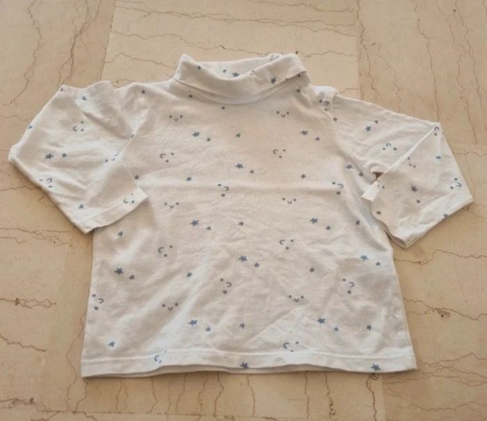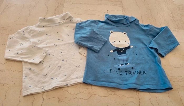 Tee-shirt manches longues et petit col roulé Tex 23 mois TBE car peu porté mais reste un mini bout d'étiquette thermocollante sur le bleu et 3 petites tâches très peu visibles sur l'arrière des manches du blanc (voir photos) N'hésitez pas à faire un tour dans mon dressing, % pour achat en lot.