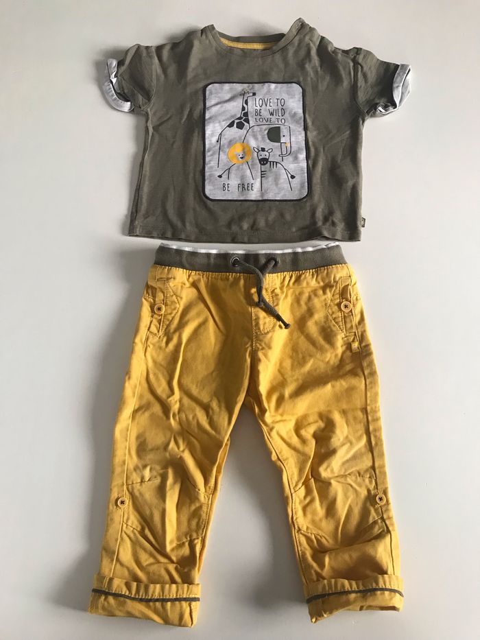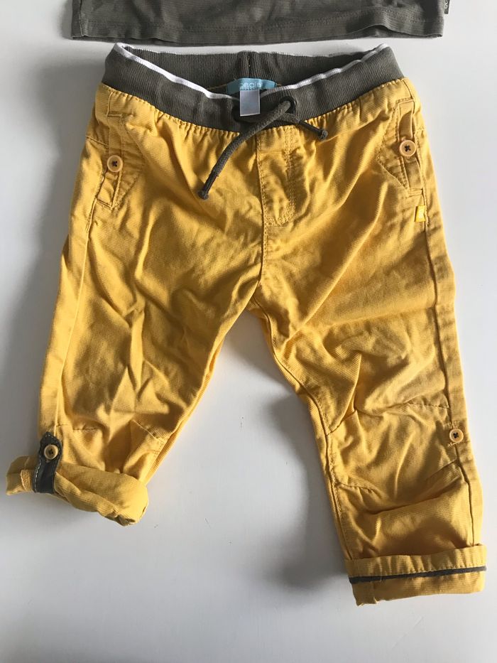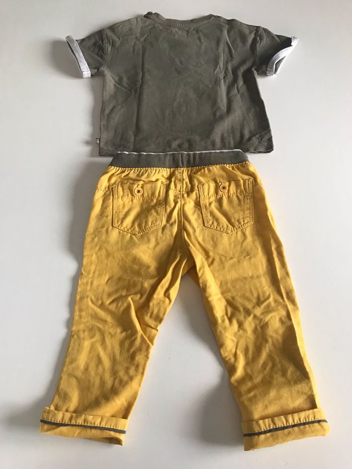 Ensemble bébé t-shirt kaki ouverture par bouton sur l’épaule (99% coton + 1% viscose) et pantalon jaune assorti 100% coton, taille élastiquée et ajustable par bouton. Marque Obaibi. 18 mois