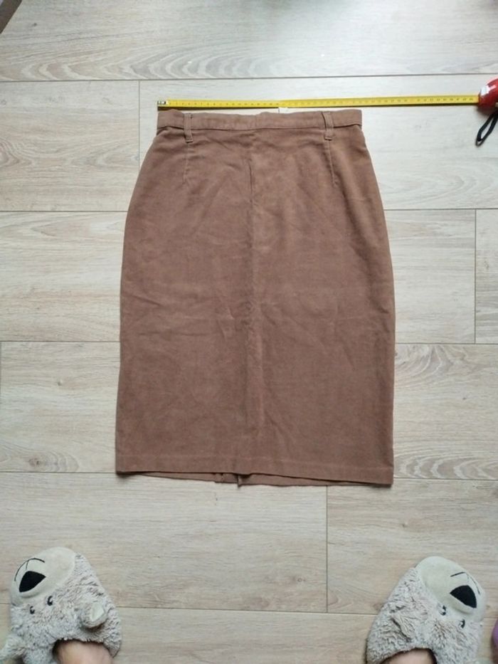 Jupe vintage Taille haute Marron matière peau de pêche Indiqué 40 mais correspond à un grand 36 petit 38 J ai mis un mètre sur les photos pour se rendre compte Petite fente a l arrière en bas