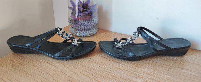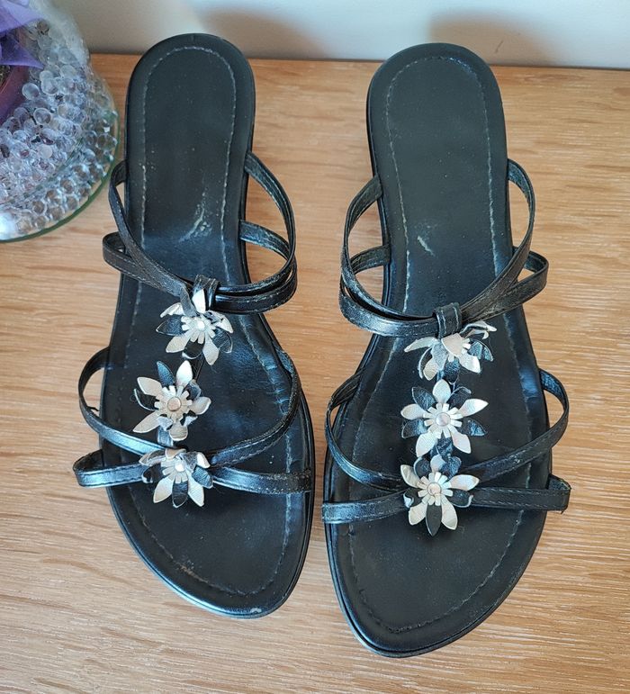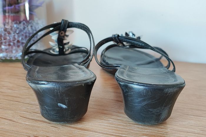 Sandales de la marque GÉMO - Noir - A lanières - Fleurs noir et argenté sur le dessus - Matière : Cuir synthétique (simili cuir) - Talon : 4 cm - Pointure : 41 ❌ Bon état car râpé par endroit Seront entièrement nettoyées pour la vente #sandalenoir41 #sandalegemo41 #sandaleafleurs41 #gemo #chaussurefemme41