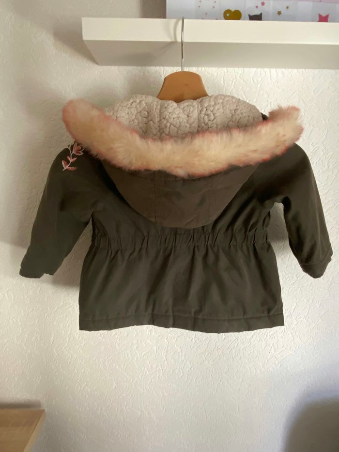 Vends manteau bébé fille, kaki et rose. Capuche avec fourrure de cette dernière amovible. Deux poches. Fermeture par fermeture éclair et pression. Intérieur du manteau et de la capuche en bouclette toute douce. Possibilité de resserrer la taille grâce au cordon. Bon état. (Voir sur les photos les petites marques d’usure). Lavable en machine. Taille 18 mois Prix: 20€