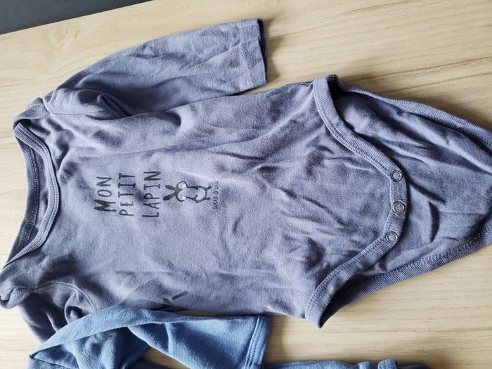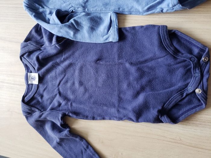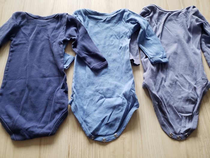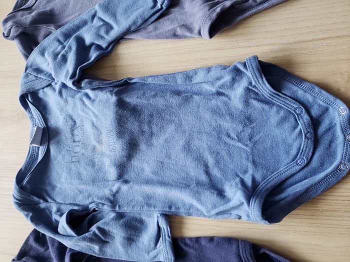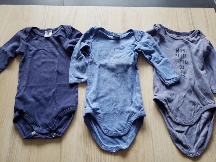 Lot de 3 bodies 2 petit bateau portés mais encore en bon état, pas de tâches 1 sucre d'orge en bon état, un peu abîmés au niveau des pressions mais peu encore servir (voir photos) Taille 6mois