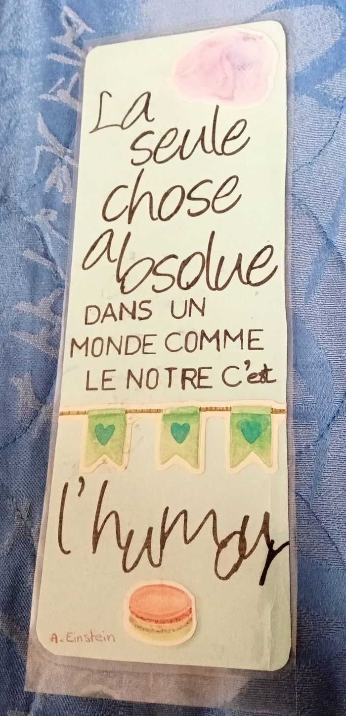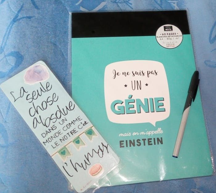 Un grand bloc de feuilles blanches 60 pages avec un texte humoristique + un marque-page avec une citation de Einstein + un stylo bille Neuf École