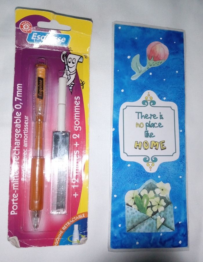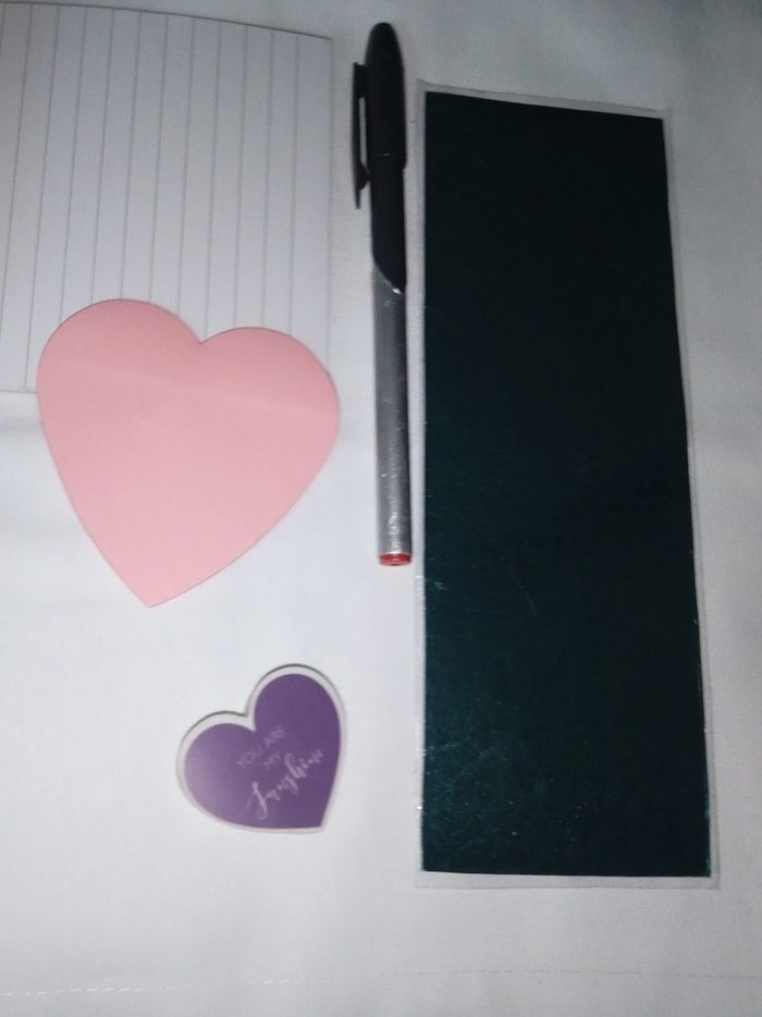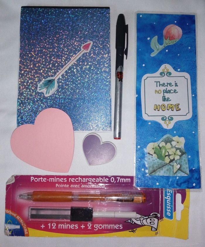 ✏️ 1 bloc ( ligne) ✏️ 1 marque page ✏️ Des post-it cœur ✏️ 1 gomme coeur ✏️ 1 porte mine rechargeable avec gomme et mines ( emballage abîmé mais article neuf) ✏️ 1 stylo bille encre rouge