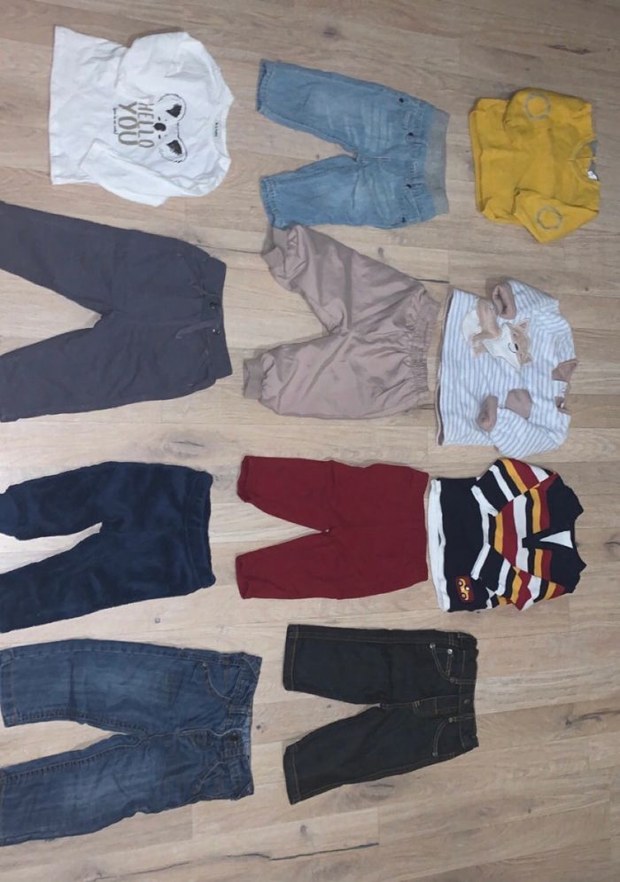 lot taille 6 mois - ensemble pull chaud bleu avec renard plus pantalon brun clair : SUPER U - ensemble pantalon rouge plus pull rayé SUPER U - 5 pantalons : tape a l’œil, kiabi, H&M.. - pull jaune : kitchoun -t-shirt manche longue blanc : kiabi (possibilité d’acheter séparé)