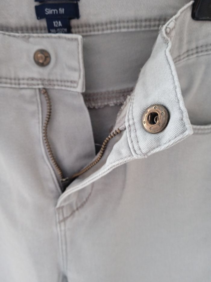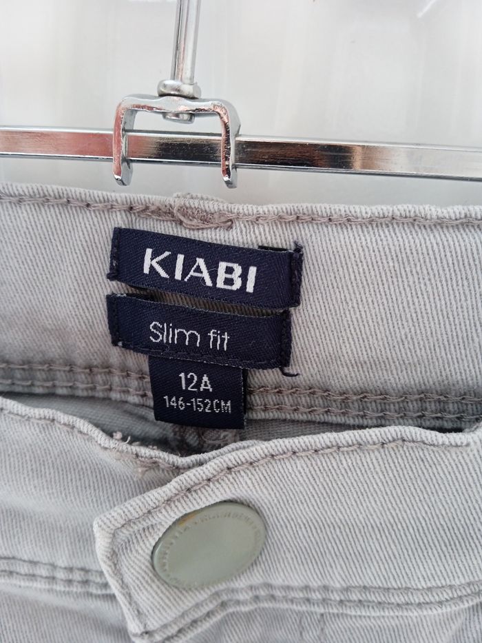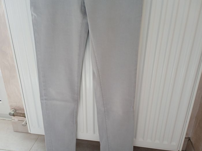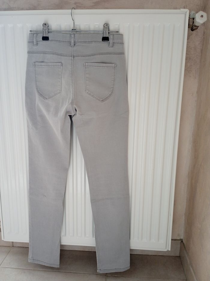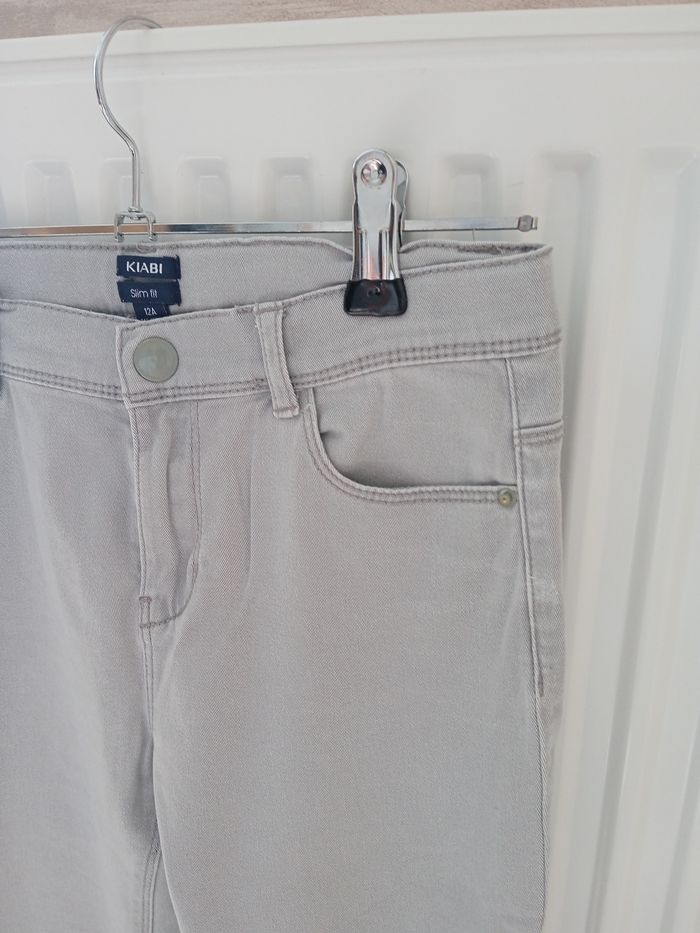 Jean de couleur gris. Marque Kiabi. Style slim fit. Ouverture bouton-pression et fermeture éclair. Comprenant élastique ajustable à la taille et passant pour ceinture. Deux poches sur le devant et deux poches à l'arrière. #fille12ansnade3033