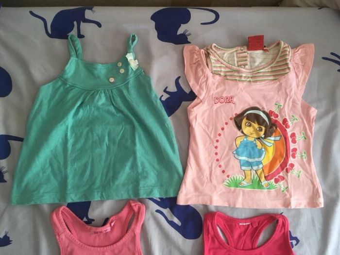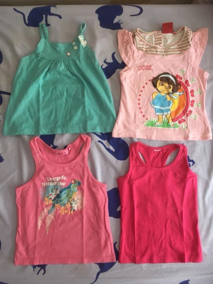 Lot de 4 hauts été 3/4 ans, vendus 6€. Le rose uni est NEUF !! (Shiny ~ Kiabi NKY ~ Dora) - Ne pas tenir compte des tailles 5 ans inscrites sur les étiquettes !!