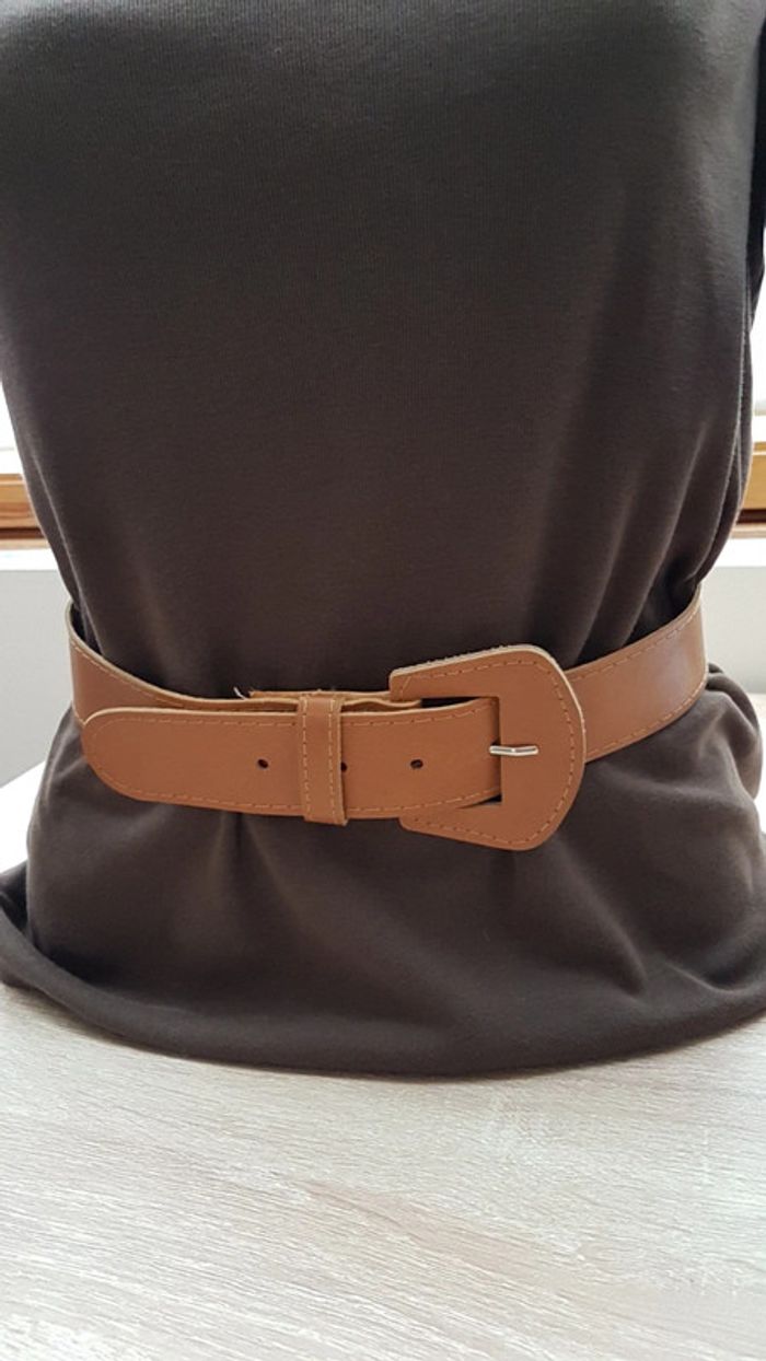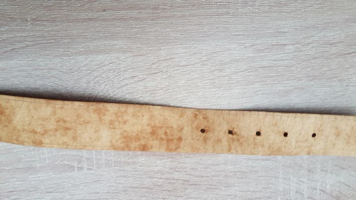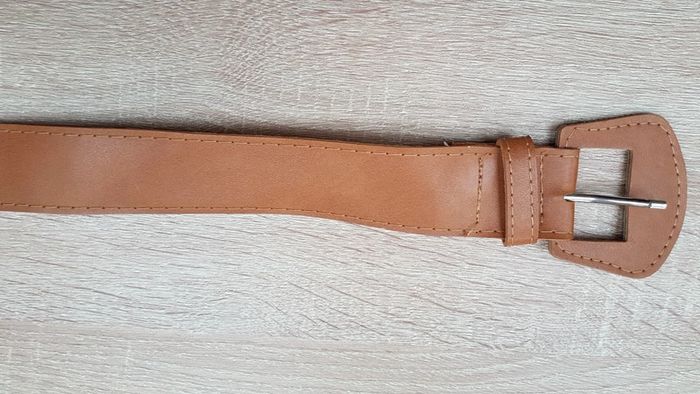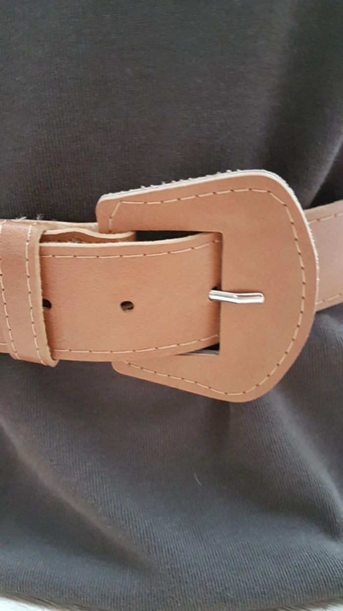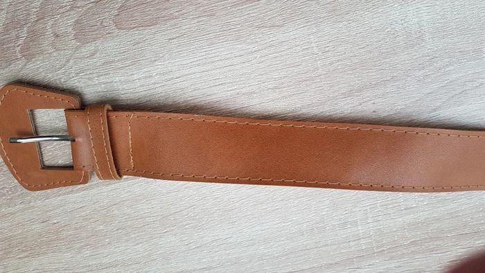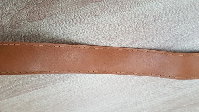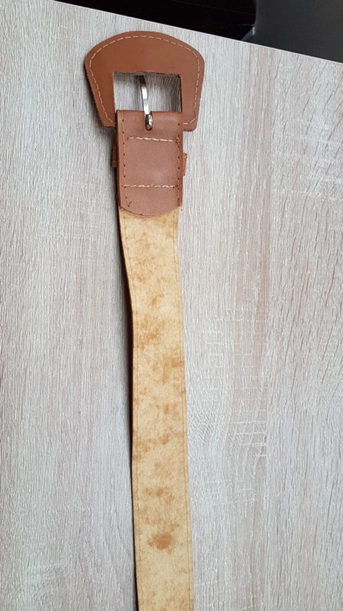 Ceinture marron clair Longueur 72 cm (entre début de la boucle et trou central), extérieur en très bon état et intérieur avec des tâches