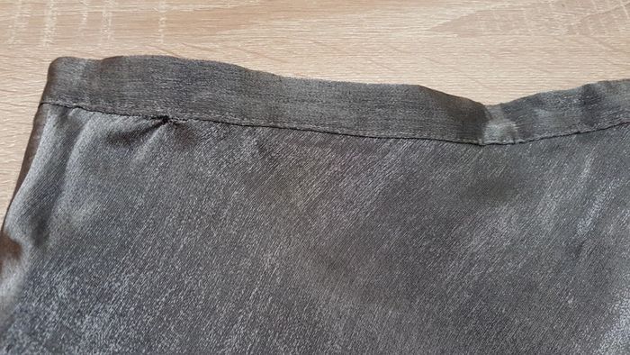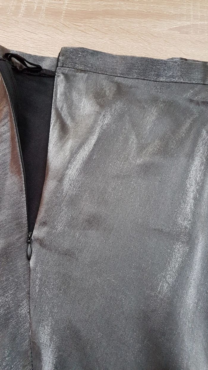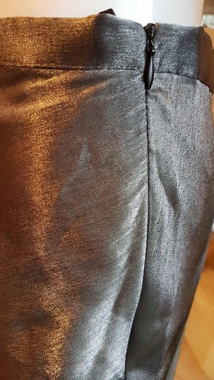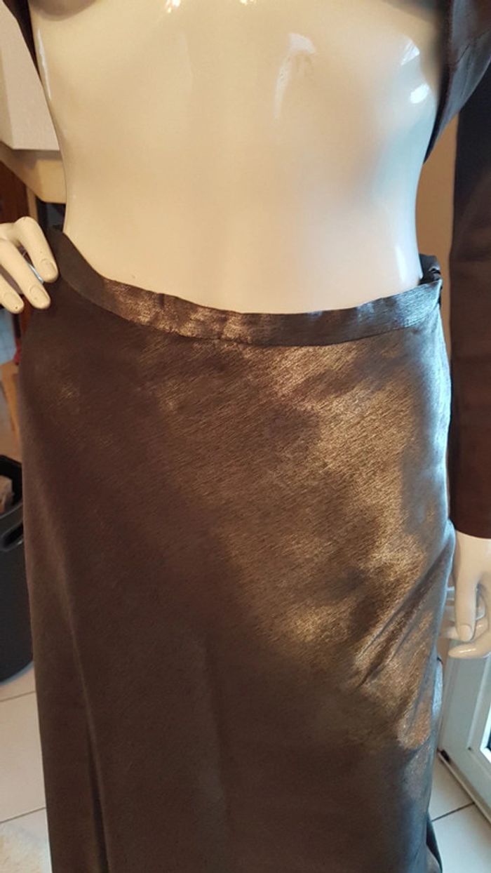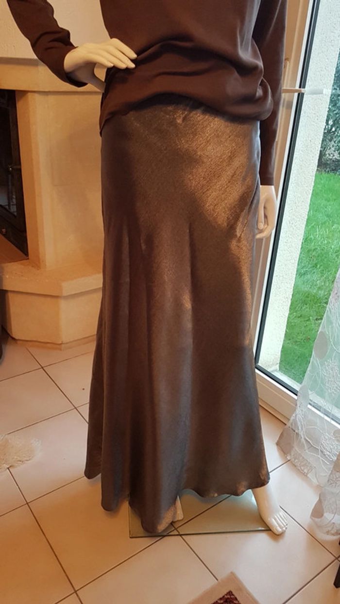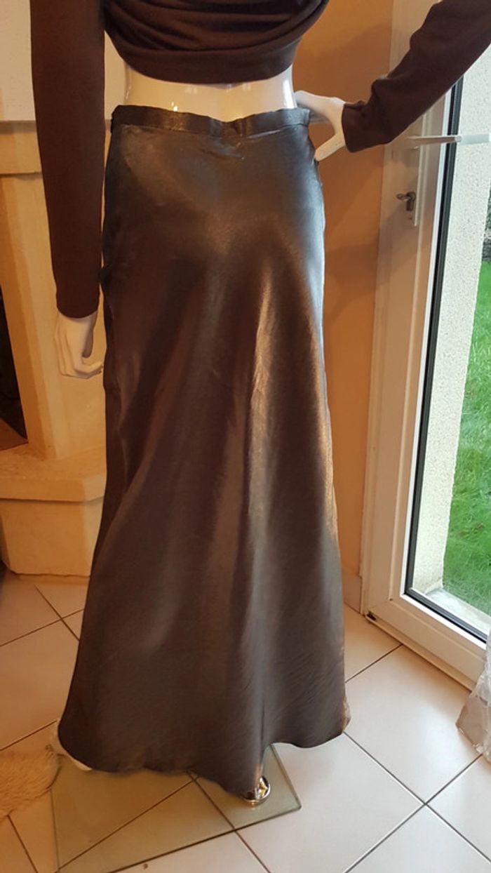 Jolie jupe longue de soirée couleur argenté brillant, tissu léger, finitions de moyenne qualité, petite reprise faite à la taille, fermeture éclair sur la hanche de 20 cm, fait son effet pour les soirées festives, taille indiquée sur l'étiquette 40 mais je vous donne ci dessous les dimensions : Largeur à la taille 36 cm, longueur 110 cm