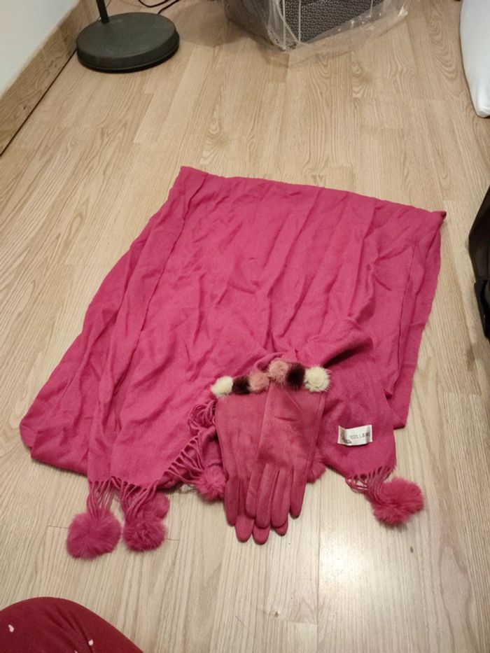 Écharpes avec pom-pom + gant 100 % laine couleur fushia