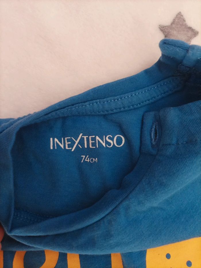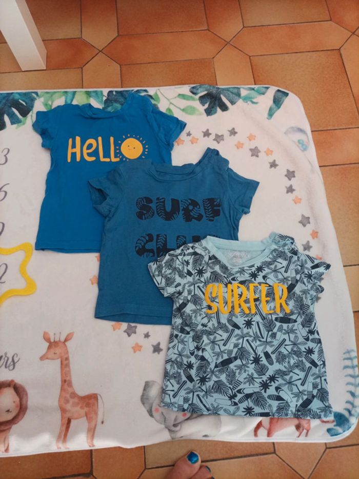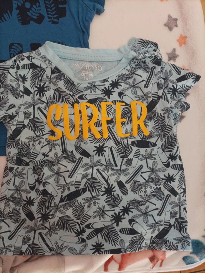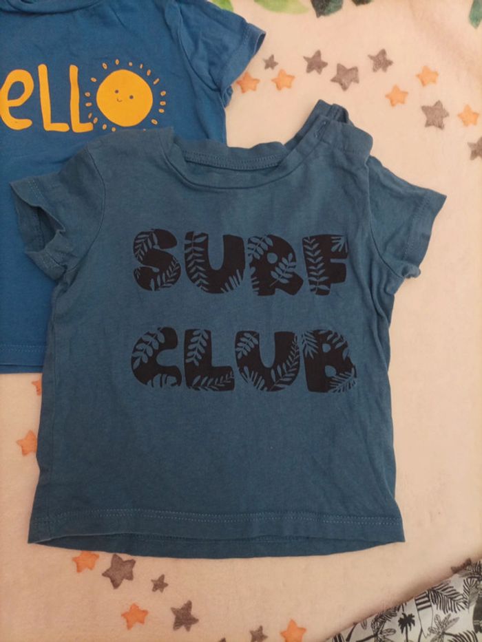 Lot de 3 tee-shirt manches courtes Marque In Extenso Taille 74 cm - Couleur bleu Message Hello Motif Soleil - Couleur bleu Message Surf Club - Couleur bleu motif palmiers et planche de surf Message surfer Très Bon état très peu porté #12mois #12moisgarcon #garcon12mois