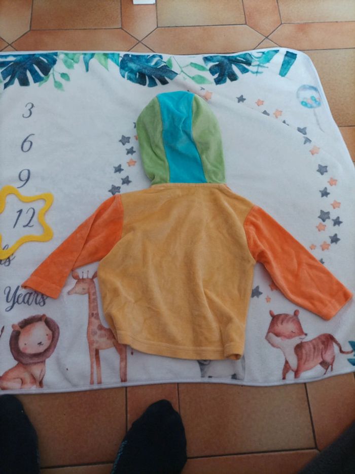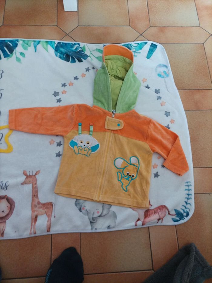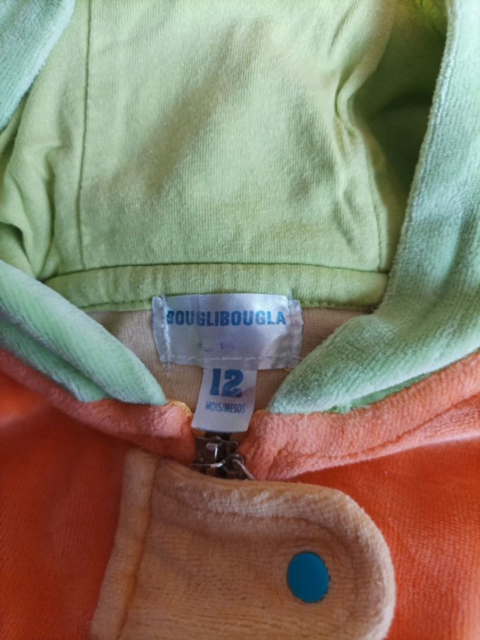 Gilet tout doux à fermeture éclair et avec capuche à visière Marque Bouglibougla Taille 12 mois Couleur jaune orange vert et bleu Animaux lapin et chien Très bon état #12mois #12moisgarcon #garcon12mois