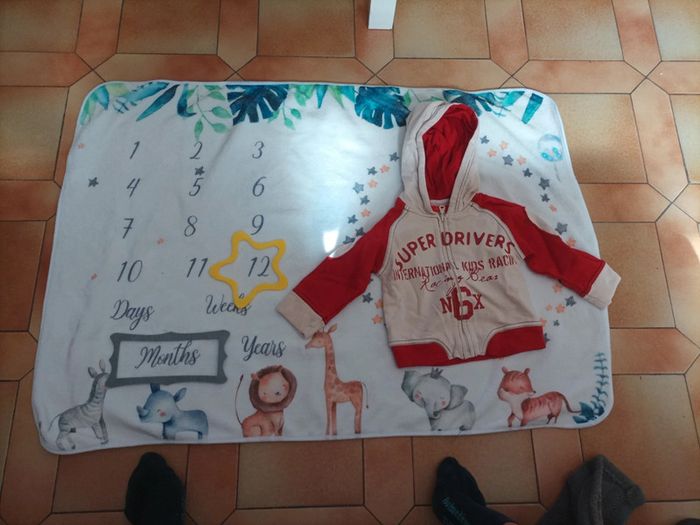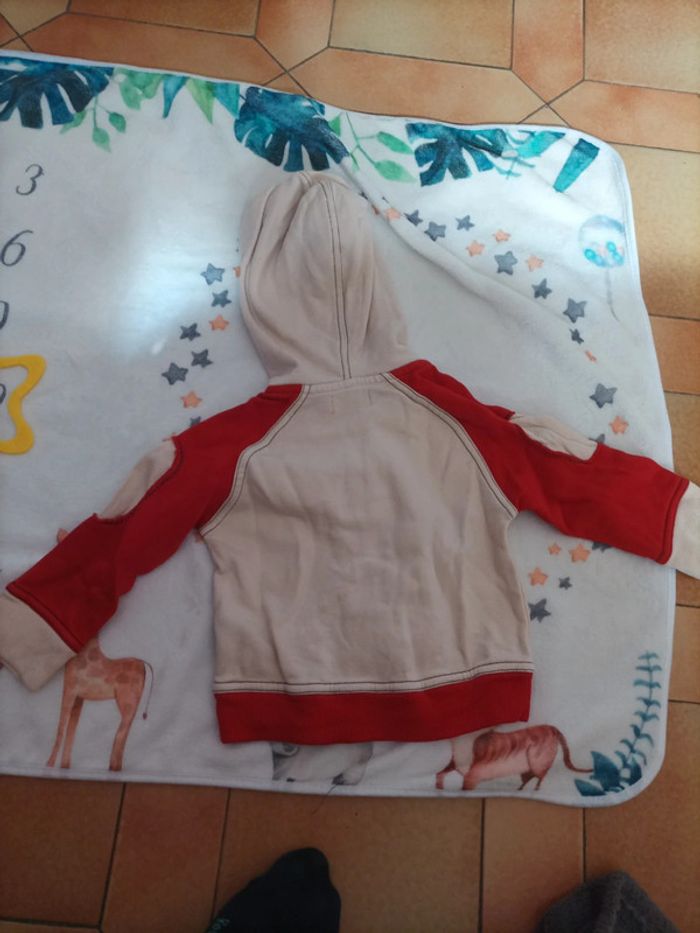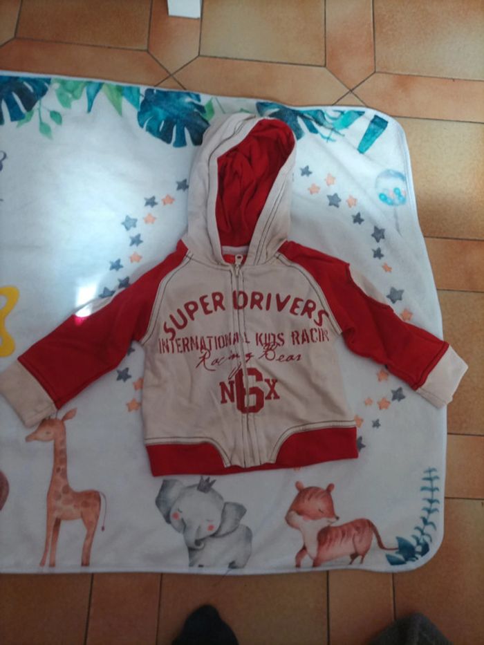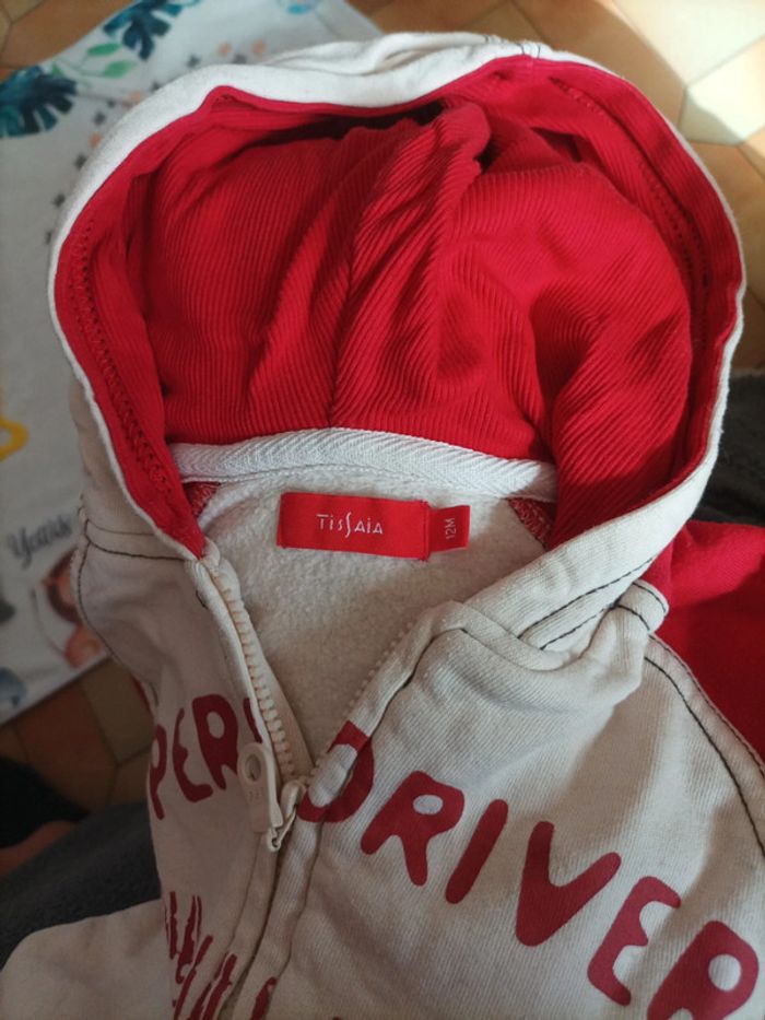 Gilet / Sweat en coton à fermeture éclair Marque Tissaia Taille 12 mois Couleur beuge et roug Superdrivers International kids racing Très bon état très peu porté #12mois #12moisgarcon #garcon12mois