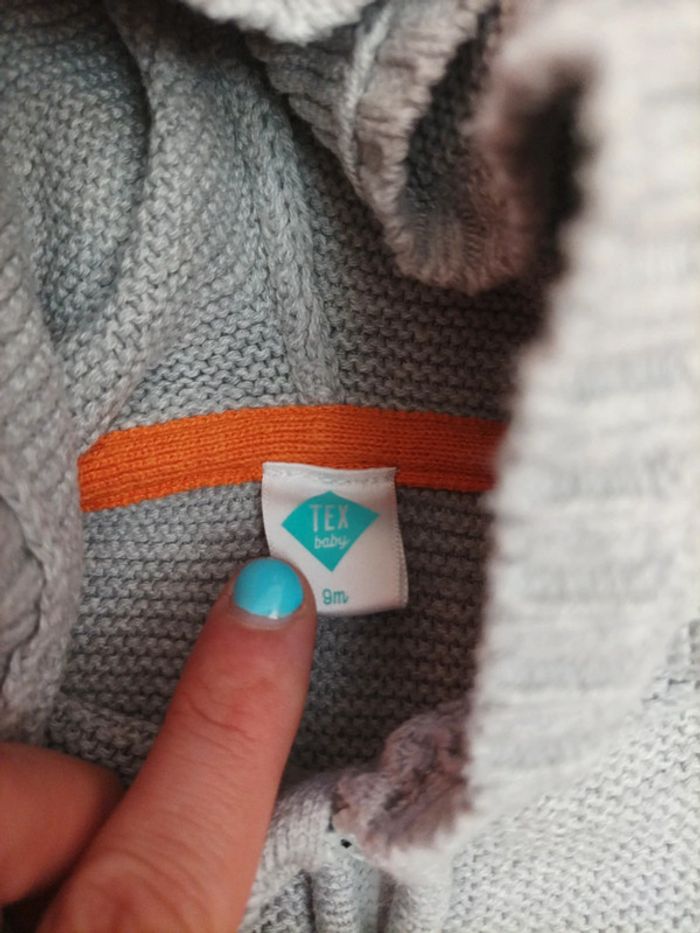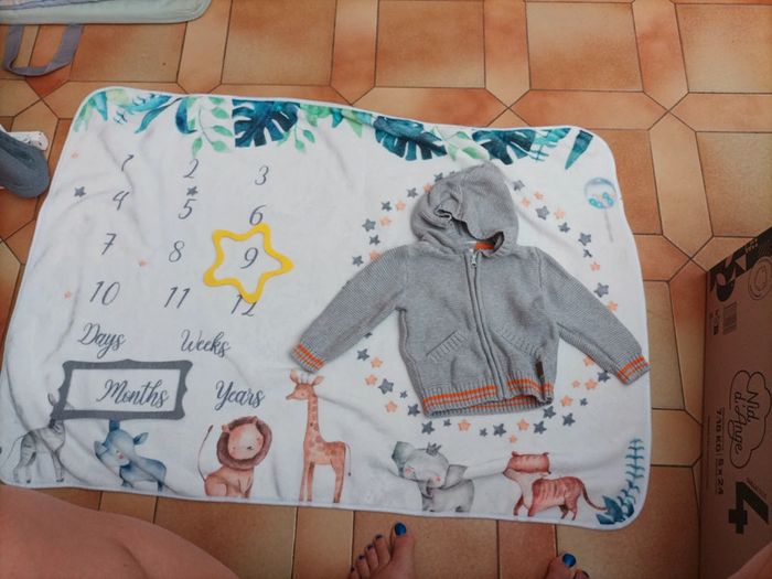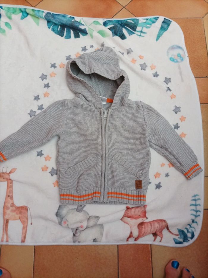 Gilet en coton à capuche Marque Tex baby Taille 9 mois Couleur gris avec des bandes orange Très Bon état très peu porté #9mois #9moisgarcon #garcon9mois
