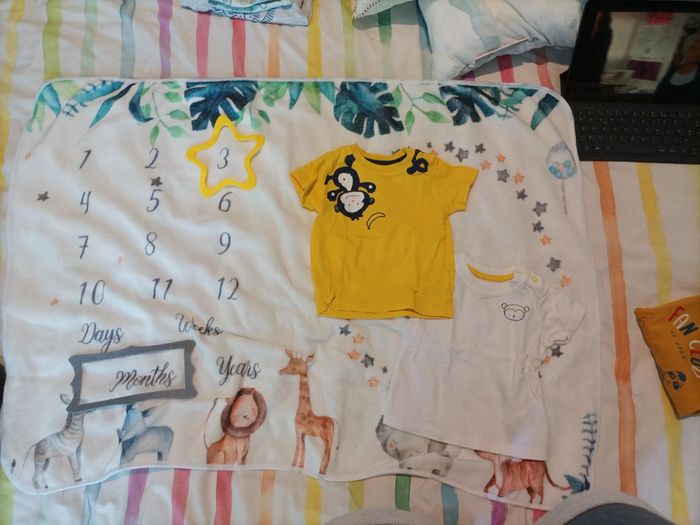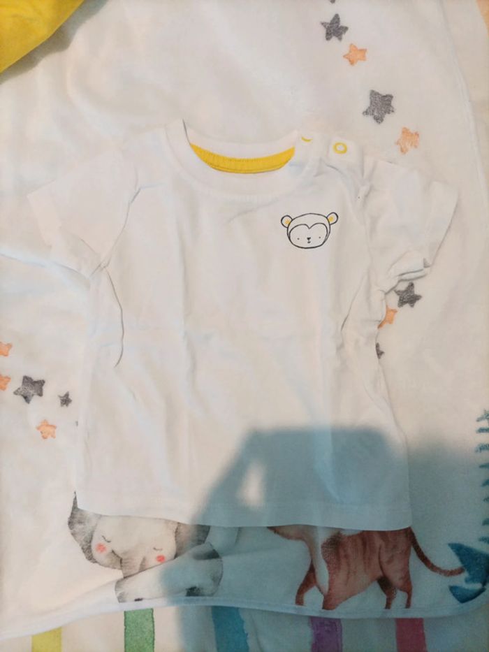 Lot de 2 Tee shirt manches courtes Marque Lupilu Ready to play Lidl Taille 2-6 mois Un jaune avec un singe et une banane Un blanc avec tête de singe Neuf jamais porté #3mois #3moisgarcon #garcon3mois