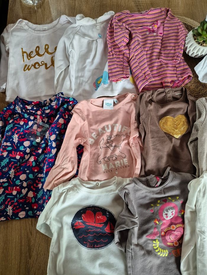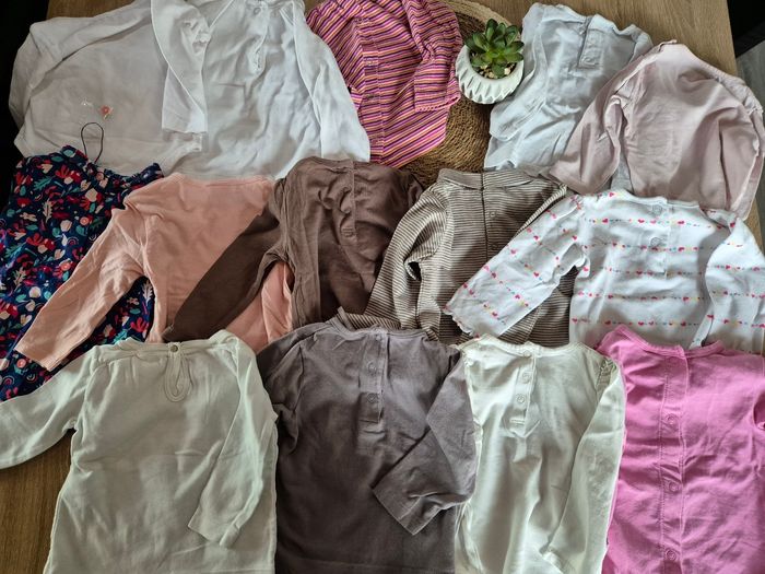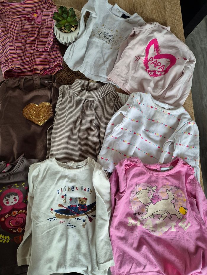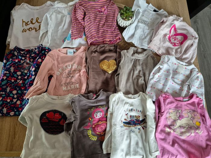 Lot de 14 tee shirts manches longues toutes marques confondues en taille 6 mois. En bon état général (les blancs sont un peu tâches), il y a un neuf et certains en très bon état.