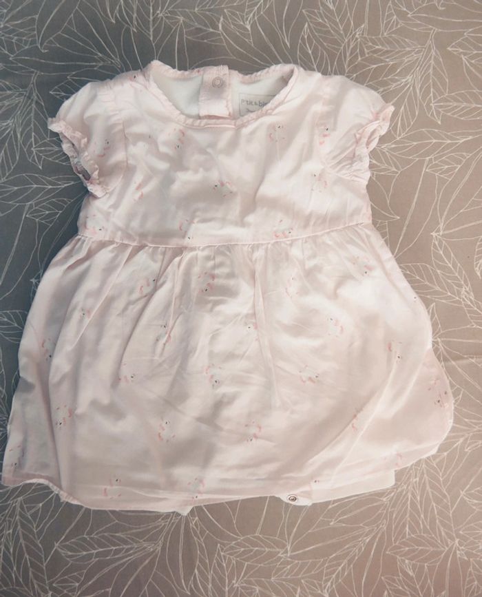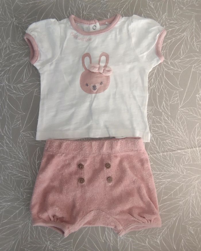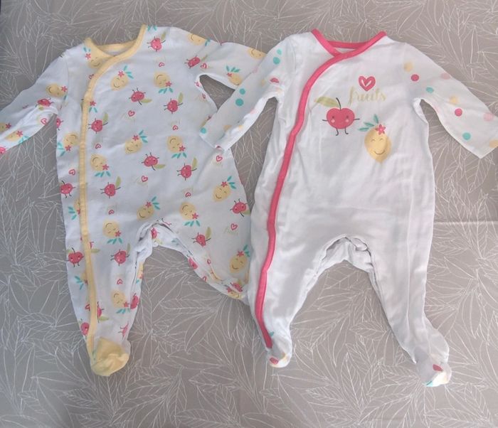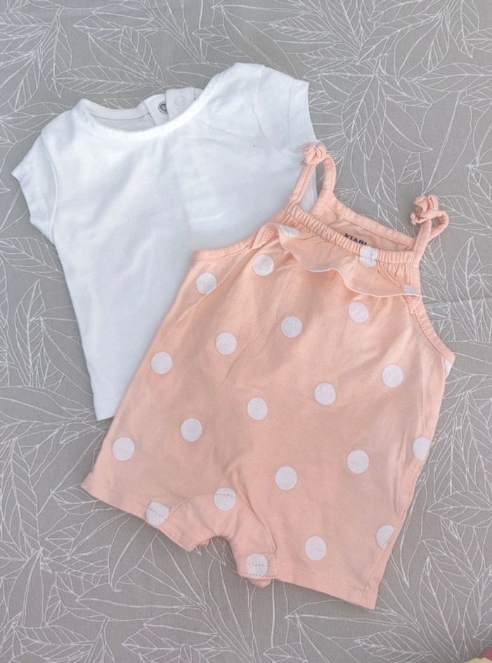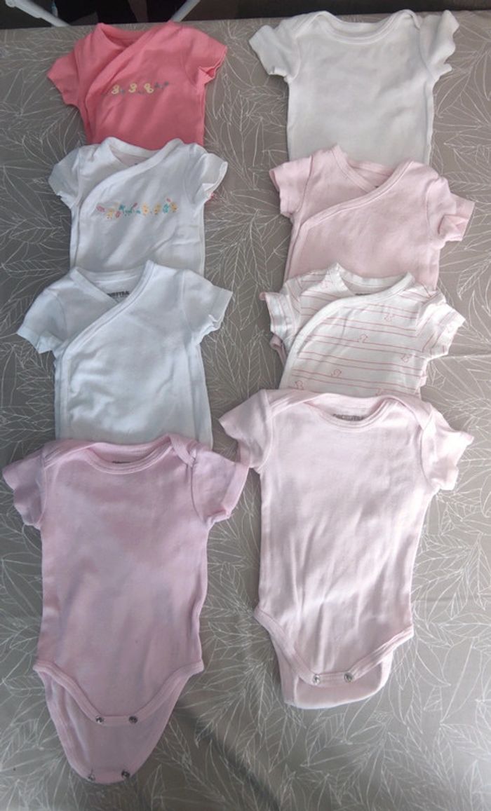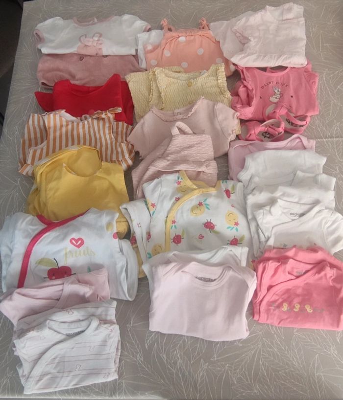 Vêtements comme neufs, très peu portés. Lot comprenant: 2 pyjamas 8 bodys manches courtes 4 robes 4 tee shirt 1 short 3 combishort 1 paire chaussures