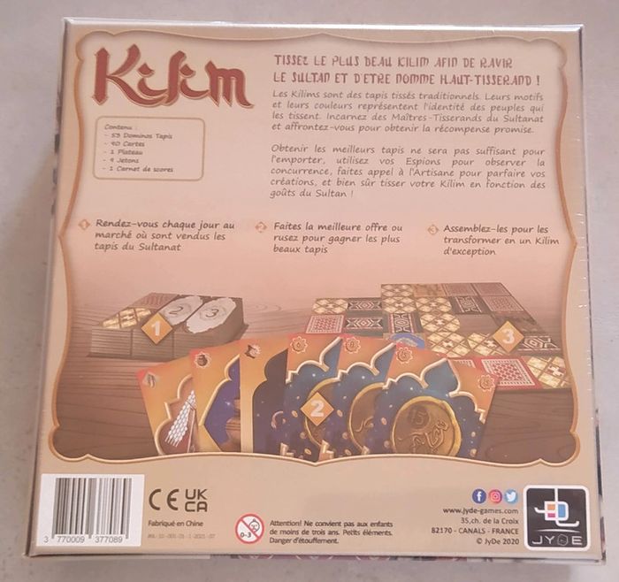 Jeu de société sous emballage - Prix ferme 2 à 5 joueurs dès 8 ans Les Kilim sont des tapis tissés traditionnels. Leurs motifs et leurs couleurs représentent l'identité des peuples qui les tissent. Incarnez des Maîtres-Tisserands du Sultanat et affrontez-vous pour obtenir la récompense promise. Obtenir les meilleurs tapis ne sera pas suffisant pour l'emporter, utilisez vos Espions pour observer la concurrence, faites appel à l'Artisane pour parfaire vos créations, et bien sûr tisser votre Kilim en fonction des goûts du Sultan ! Trois jours (trois manches) pour se rendre au marché, acheter des bouts de tapis, enchérir pour les assembler devant soi en un Kilim d'exception ! Ludpresta
