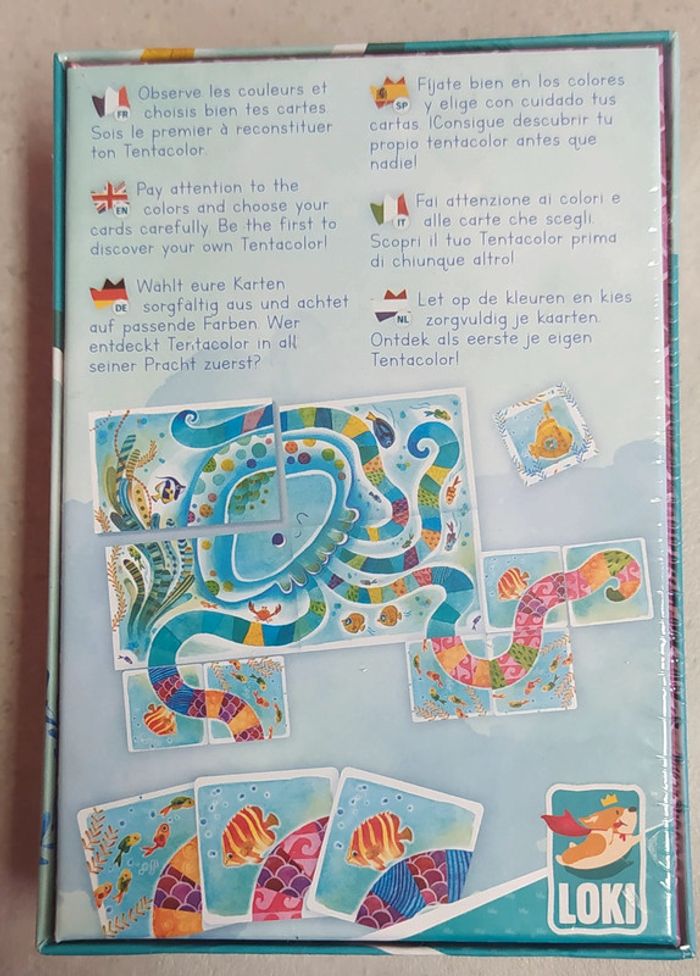 Jeu de société sous emballage - Prix ferme 2 à 4 joueurs dès 4 ans Tentacolor : Qui pourra photographier Tentacolor en entier ? Au fond des océans vit une créature aussi étrange que mystérieuse. Tout ce qu'on sait d'elle, c'est qu'elle est pourvue de spectaculaires tentacules colorés ! Les scientifiques ont mené de nombreuses expéditions, mais ils n'ont jamais réussi à photographier cette créature, qu'ils ont baptisée Tentacolor. Ils s'en remettent à toi, intrépide explorateur ! Plonge au fond des mers, trouve Tentacolor et prends des photos de ses splendides tentacules. Il te faudra toutefois être plus malin que les autres explorateurs, car un seul parmi vous pourra photographier Tentacolor en entier ! Avec ses illustrations adorables et colorées, Tentacolor est un jeu de collection simple et rapide qui saura plaire aux plus jeunes joueurs. Tentacolor : Collecte, pose et un zeste de draft ! Chaque joueur va tenter d'allonger l'un des tentacules de Tentacolor en essayant de le faire avec des couleurs déjà posée. Chaque carte tentacule est composé de deux couleurs. A son tour, le joueur va donc : piocher une carte, poser l'une des 3 cartes en main pour allonger son tentacule et passer l'une des deux cartes restantes au joueur suivant. Pour gagner, il faut réussir à poser 5 cartes tentacules à la suite avec une couleur en commun. Mais attention aux cartes rencontre : le Banc de Poissons, le Spécimen rare ou le très redouté Requin ! Une fois, tout cela maitrisé, passez aux règles de l'expert océanologue ! Ludipresta