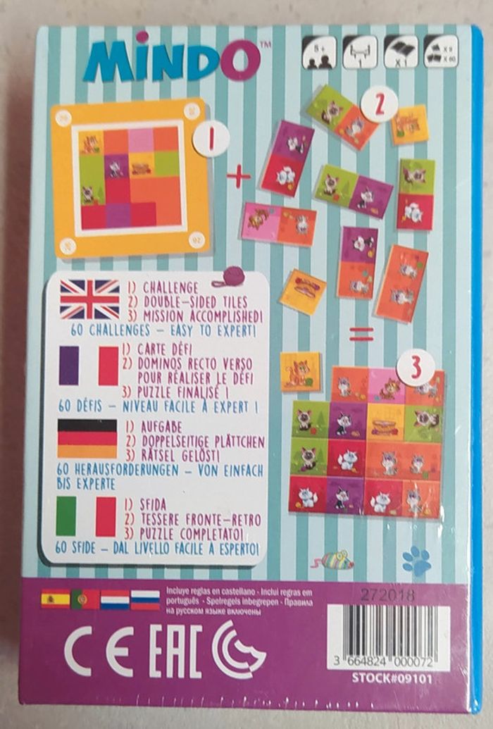 Jeu de société sous emballage, prix ferme 1 joueur dès 5 ans Roxy veut aller dire bonjour à ses amis avant de retourner à son panier. Il faudra tourner et retourner les tuiles recto-verso jusqu’à reconstituer le motif coloré de la carte défi. Une seule solution est possible... Un jeu accessible dès 5 ans pour des heures de casse-tête en perspective grâce aux différents niveaux de difficulté. Outre la thématique et les illustrations qui changent, ce sont également tous les défis qui varient entre les différents Mindo. Ludipresta