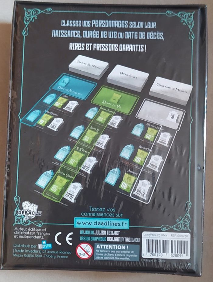 jeu de société sous emballage - prix ferme 1 à 10 joueurs dès 12 ans Dans Deadlines vous allez devoir classer des personnes connues par rapport à leur date de naissance, leur durée de vie ou leur date de décès. Celui ou celle qui aura fait le moins d'erreurs à la fin de la partie aura gagné. A chaque tour, un joueur va récupérer une carte "célébrité" de son choix parmi trois piles, et la placer correctement dans la colonne de son choix. Ainsi, il pourra décider de deviner soit sa date de naissance, soit sa date de décès, ou encore sa durée de vie. Il faudra alors placer la carte face cachée avant, après, ou entre les cartes déjà présentes puis la retourner. Si la valeur de référence est bonne, la carte ne bouge pas. Si le joueur s'est trompé, il récupère la carte en signe d'erreur. On peut se débarasser de ses erreurs grâce à des cartes spéciales. Si on place correctement une carte noire dans une des colonnes et qu'on donne la cause de son décès, on peut retirer une de nos erreurs. Ludipresta
