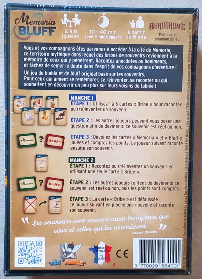Jeu de société sous emballage - Prix ferme 2 à 8 joueurs dès 6 ans Memoria Bluff est un jeu original dans lequel vous jouerez avec vos souvenirs ! Un jeu d’ambiance original qui propose de partager nos souvenirs ou anecdotes de manière ludique. Se remémorer, se raconter ou en découvrir un peu plus sur les autres… tout en tentant de les berner. Memoria Bluff est un jeu dans lequel les joueurs devront raconter des souvenirs à partir d’images piochées au hasard. Si vous n’en trouvez pas, vous pouvez en inventer un et bluffer mais tâchez d’être convaincant car les autres joueurs devront alors deviner si le souvenir raconté est véridique ou s’il a été inventé.