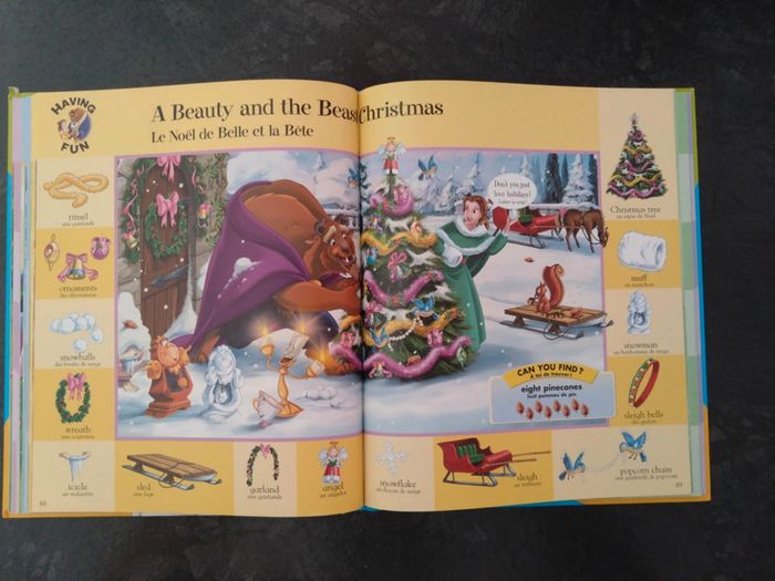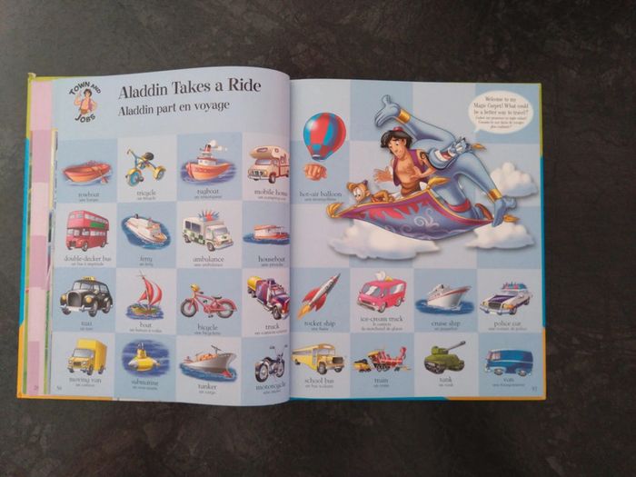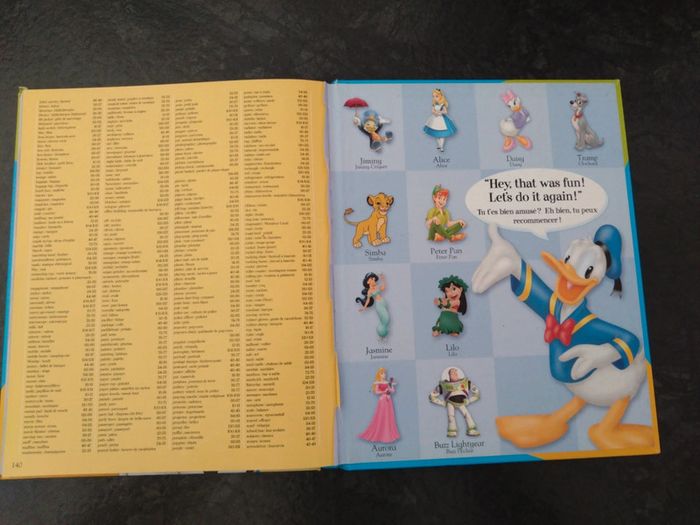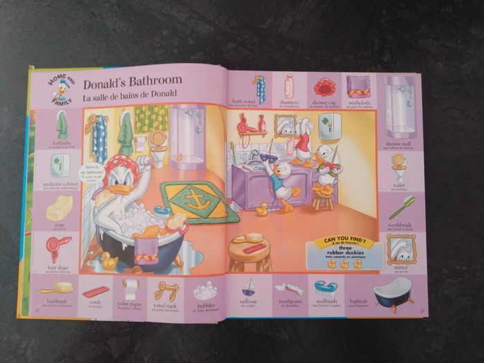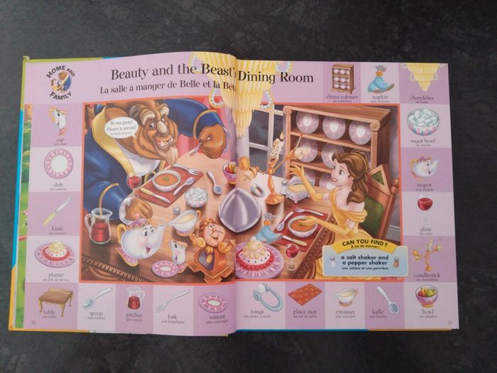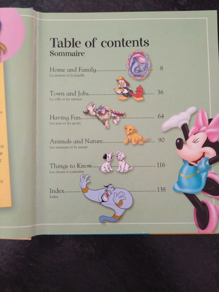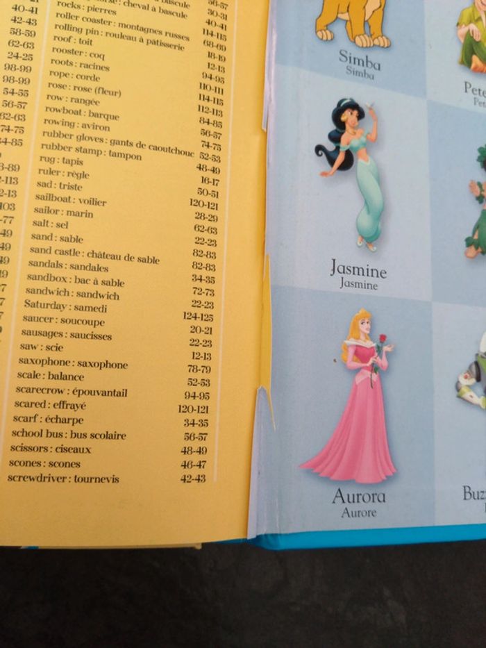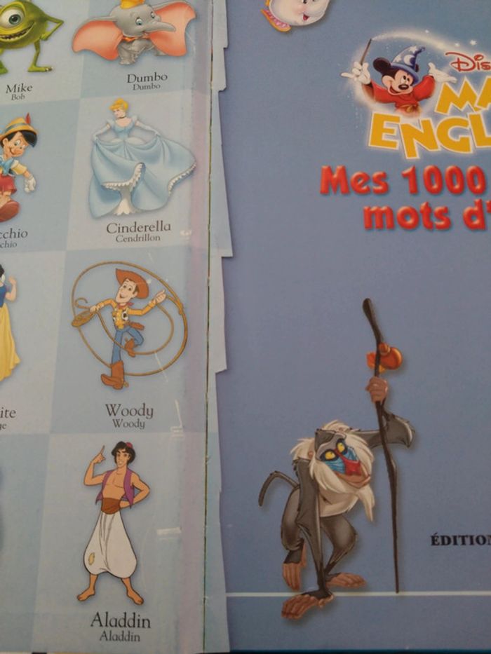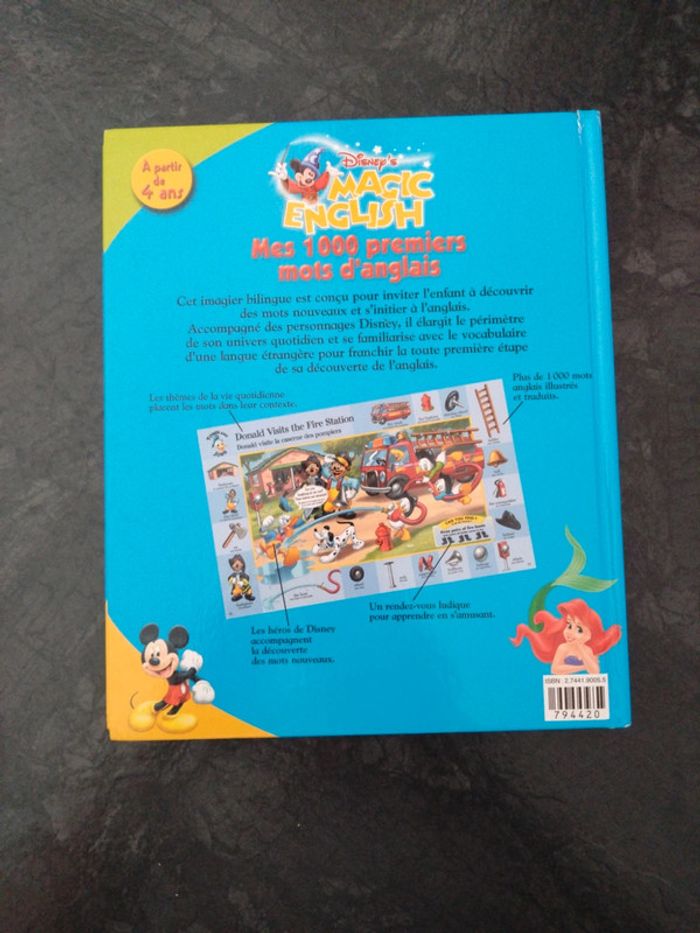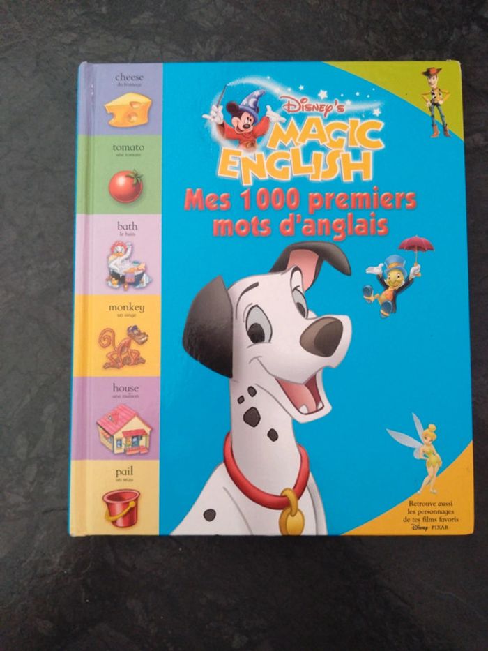 Livre Disney/Pixar Magic english - mes 1000 premiers mots d'anglais. Pour apprendre doucement l'enfant à partir de 4 ans à comprendre les premiers mots essentiels d'anglais tel que les couleurs, les verbes ou encore les objets avec l'univers de ses héros Disney préférés. Deux pages ou apparaissent les différents personnages du livre ont été découpée (voir les 2 dernières photos). Petites traces d'usure et d'imperfections dues à l'utilisation dans les mains d'un enfant... 🫤 Je met en état satisfaisant par rapport à ça car l'intérieur est très propre et parfaitement lisible. #jeremyamaha_DISNEY #jeremyamaha_ENFANTS