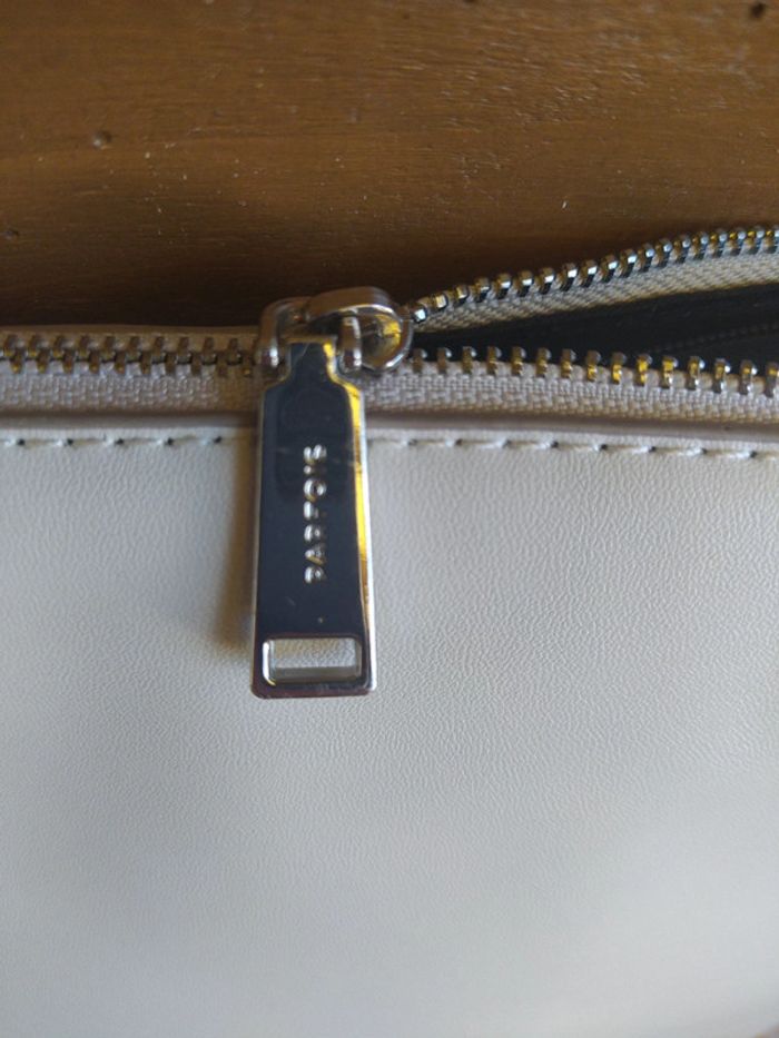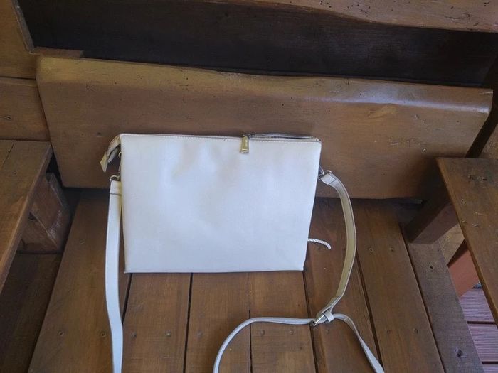 Porté une fois. Bandoulière amovible pour le porter comme une pochette 3 poches intérieures dont une centrale avec fermeture éclair 30cm de large x 23 cm de haut Matière synthétique