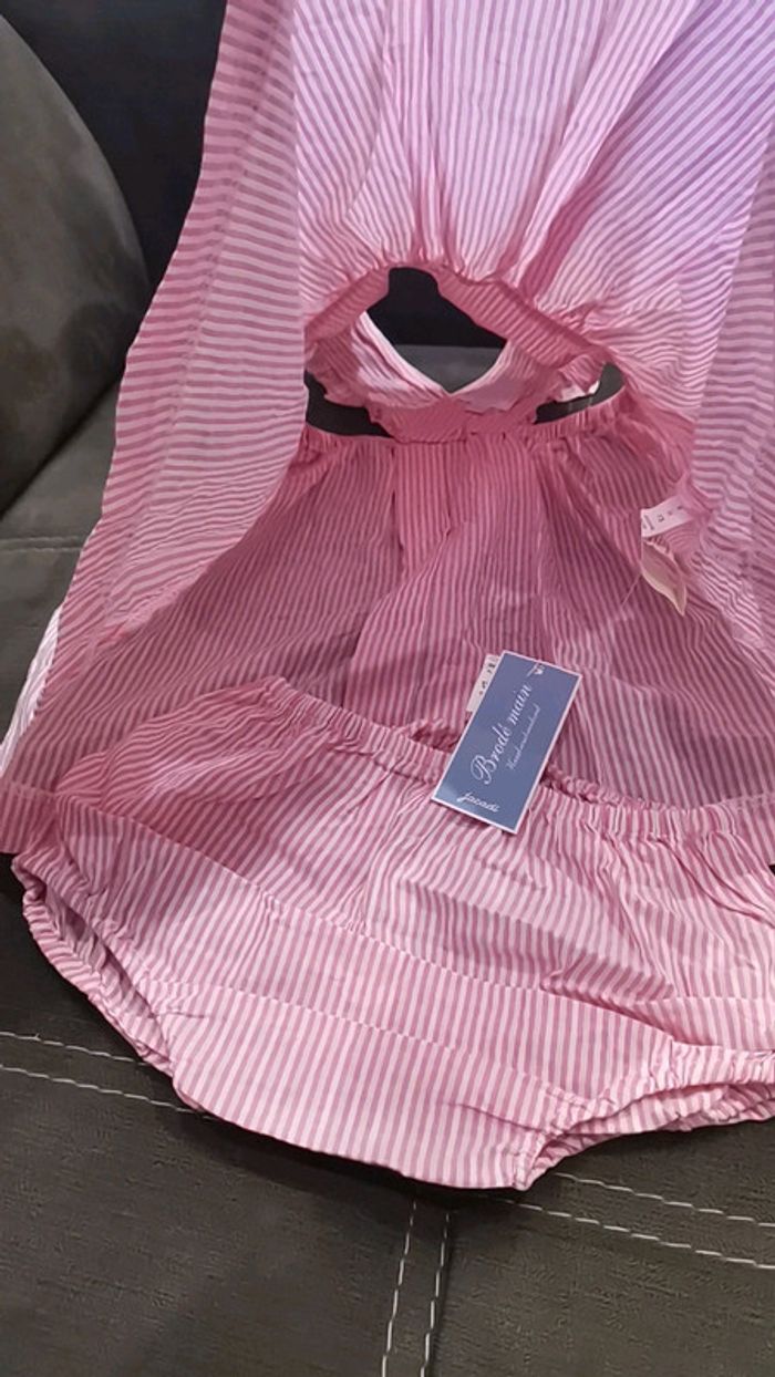 Ensemble neuf Jacadi, robe et son bloomer assorti à rayures rose et blanche, croisé dans le dos avec ses petits volants, taille 6 mois