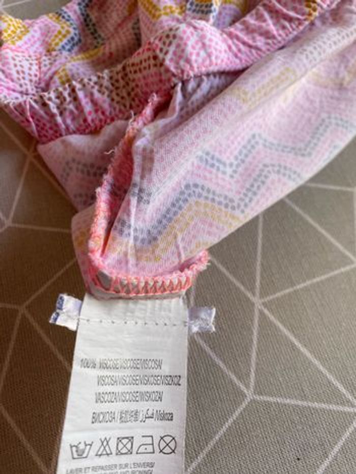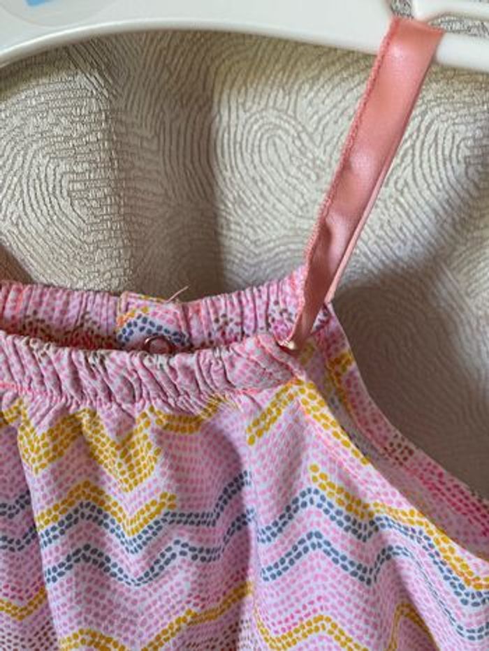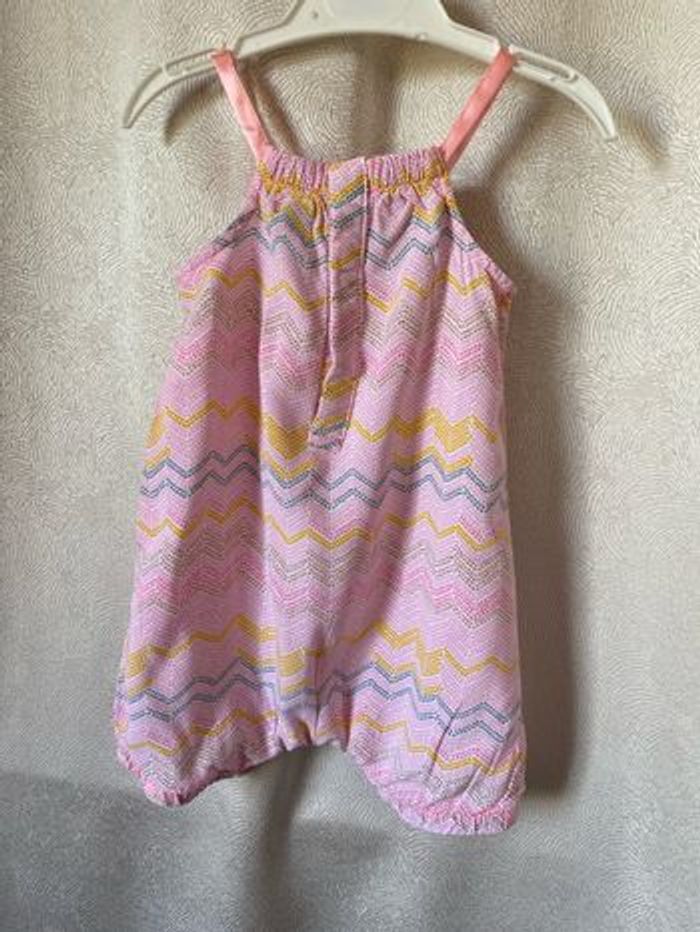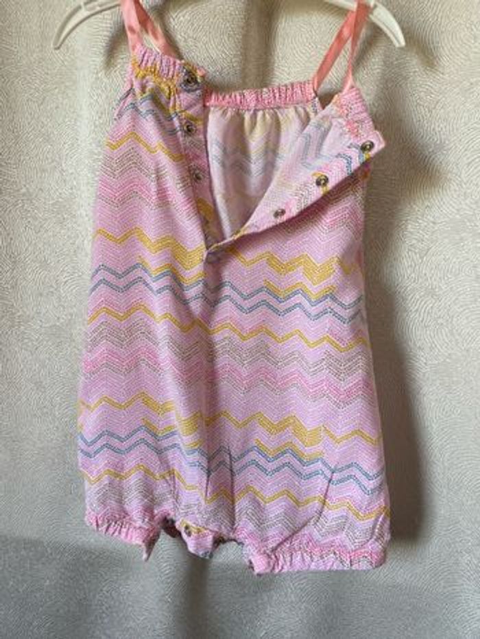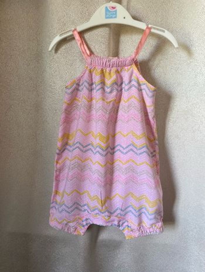 Très jolie combinaison short imprimé zigzag rose jaune gris Bretelles satin rose 100% viscose Taille 6 mois Kiabi
